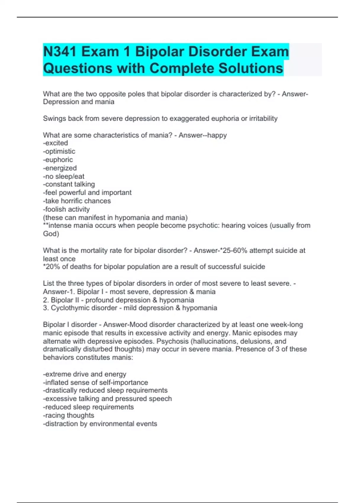 N341 Exam 1 Bipolar Disorder Exam Questions with Complete Solutions