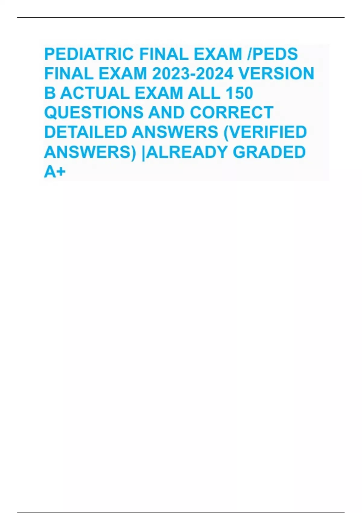 PEDIATRIC FINAL EXAM /PEDS FINAL EXAM VERSION B ACTUAL EXAM ALL 150 QUESTIONS AND CORRECT DETAILED ANSWERS (VERIFIED ANSWERS) |ALREADY GRADED A+