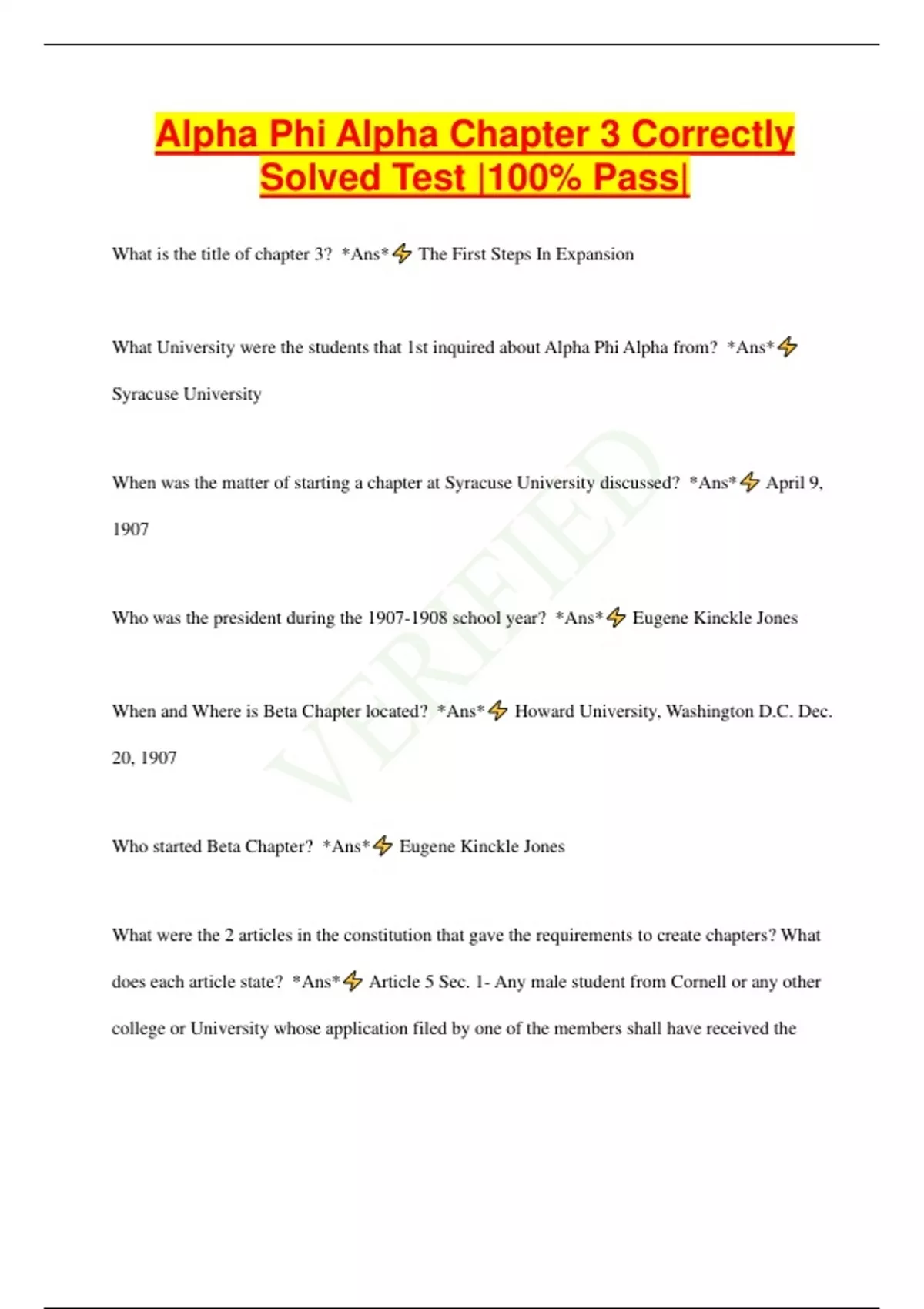 Alpha Phi Alpha Chapter 3 Correctly Solved Test |100% Pass| What is the title of chapter 3? *Ans* The First Steps In Expansion What University were the students that 1st inquired about Alpha Phi Alpha from? *Ans* Syracuse University When was the matter of starting a chapter at Syracuse University discussed? *Ans* April 9, 1907 Who was the president during the school year? *Ans* Eugene Kinckle Jones When and Where is Beta Chapter located? *Ans* Howard University, Washington D.C. Dec. 20, 1907 Who started Beta Chapter? *Ans* Eugene Kinckle Jones What were the 2 articles in the constitution that gave the requirements to create chapters? What does each article state? *Ans* Article 5 Sec. 1- Any male student from Cornell or any other college or University whose application filed by one of the members shall have received the approval of all the members of the chapter to which it was submitted and who shall have undergone the prescribed initiation, is an active member. Article 10 Sec. 1- All chapters shall consist of at least 6 members. Sec. 2- All chapters shall be