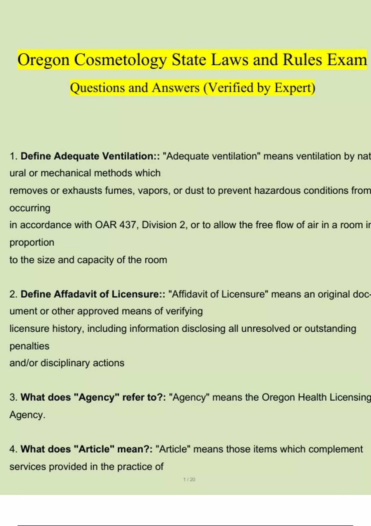 Oregon Cosmetology State Laws and Rules Exam Questions and Answers (Verified by Expert) Define Adequate Ventilation:: "Adequate ventilation" means ventilation by natural or mechanical methods which removes or exhausts fumes, vapors, or dust to prevent hazardous conditions from occurring in accordance with OAR 437, Division 2, or to allow the free flow of air in a room in proportion to the size and capacity of the room 2. Define Affadavit of Licensure:: "Affidavit of Licensure" means an original document or other approved means of verifying licensure history, including information disclosing all unresolved or outstanding penalties and/or disciplinary actions 3. What does "Agency" refer to?: "Agency" means the Oregon Health Licensing Agency. 4. What does "Article" mean?: "Article" means those items which complement services provided in the practice of 2 / 20 barbering, hair design, esthetics or nail technology, including but not limited to neck-strips, neck dusters, towels or linens, and cloth or plastic capes. 5. Define Authorization:: "Authorization" has the definition set forth in ORS 676.580 and means a certificate, license, permit or registration issued by the Oregon Health Licensing Agency that allows a person to practice one of the occupations or professions or maintain a facility subjecto the authority of the boards and councils listed in ORS 676.583. 6. What does Chemical Service mean?: "Chemical service" means the use of any product which restructures or removes hair or changes the shape or appearance of skin, hair or nails. 7. What does a "Common Area" mean?: "Common area" means an area of a facility which is used by all authorization holders performing services, including, but not limited to reception areas, dispensing areas, sinks, shampoo bowls, hair dryers, hair dryer areas and employee lounges. 8. What does "Disinfect" mean?: "Disinfect" means using a process to destroy harmful organisms, including bacteria, viruses, germs and fungi. 3 / 20 9. What does "Dispensing Area" mean?: "Dispensing area" means an area with non-porous surfaces and a sink with hot and cold 4 / 20 running water where service preparations are conducted, including, but not limited to, mixing of chemicals, cleaning of tools and equipment, disposing of residues and rinsing parts of the body exposed to chemicals. 10. What qualifies as an educational institution?: "Educational Institution" means an Oregon high school under ORS 335, Oregon career school licensed under ORS 345 or an Oregon community college under ORS 341. 11. Define "EPA":: "EPA" means Environmental Protection Agency, a branch of thefederal government, which approves and registers chemical compounds and agents. 12. What does Equiptment mean?: "Equipment" means those items needed to operate a facility, including, but not limited to, waiting chairs, barber or styling chairs, shampoo chairs, cabinets, sinks, shampoo bowls, stationary dryers, pedicure bowls or whirlpool foot spas, paraffin wax containers, and nail technology tables. 13. What does "Fire Retardant Container" mean?: "Fire retardant container" means an airtight metal container for disposing of chemical waste or storing linens with chemical residue. 5 / 20 14. Define High Level Disinfectant:: High-level disinfectant" means a chemical agent, which has demonstrated tuberculocidal activity and is registered with the EPA. 15. Define Low Level Disinfectant:: "Low-level disinfectant" means a chemical agent which has demonstrated bactericidal, germicidal, fungicidal, and limited virucidal activity and is registered with the EPA. 16. Define Materials and Supplies:: "Materials and supplies" means those items which complement the use of tools, including but not limited to hair tints, bleaches, permanent wave solutions, hair oils, shampoos, rinses, disinfectants, and chemicals. 17. What does "Natural Person" mean?: "Natural Person" means a living, individual, human being. 18. What does "Official Transcript" mean?: (a) An original document authorized by the appropriate office in the Oregon Department of Education and certified by an educational institution indicating applicant identity information, each field of practice enrolled under, specific hour requirements for each field of practice if 6 / 20 applicable, final practical examination scores for each field of practice, enrollment information and a signature from an authorized representative on file with the agency. Original documents must be submitted directly to the agency from the educational institution by United States Postal Service mail or other recognized mail service providers in a sealed envelope; OR Non-original documents are only accepted when approved by the Agency. 19. Define "Premises": "Premises" means the entire area of a facility, licensed by the agency as a facility defined under ORS 690.005. 20. What does "Sharp edged or pointed, non-electrical tools and implements" mean?: "Sharp edged or pointed, non-electrical tools and implements" means thoseitems which may on occasion pierce or cut the skin and draw blood, including razors, cuticle nippers, cuticle pushers, nail clippers, tweezers, comedone extractors, shears, and metal naifiles. 21. What does soiled mean?: "Soiled" means an article that has been used and has not been cleaned or disinfected for use on the next client. 7 / 20 22. Define tools and implements:: "Tools and implements" means all portable articles and instruments, which the authorization holder uses when performing services on clients, including, but not limited to combs, shears, clippers and yoyettes. 23. Define work area:: "Work area" means an area where services are performed and preparations are conducted, including, but not limited to shampoo area, work stations and dispensing area. 24. What must authorization holders do when it comes to the state regulationsand federal ventilation requirements?: (1) Authorization holders must observe the Department of Human Services, Oregon Health Authority, and other ci