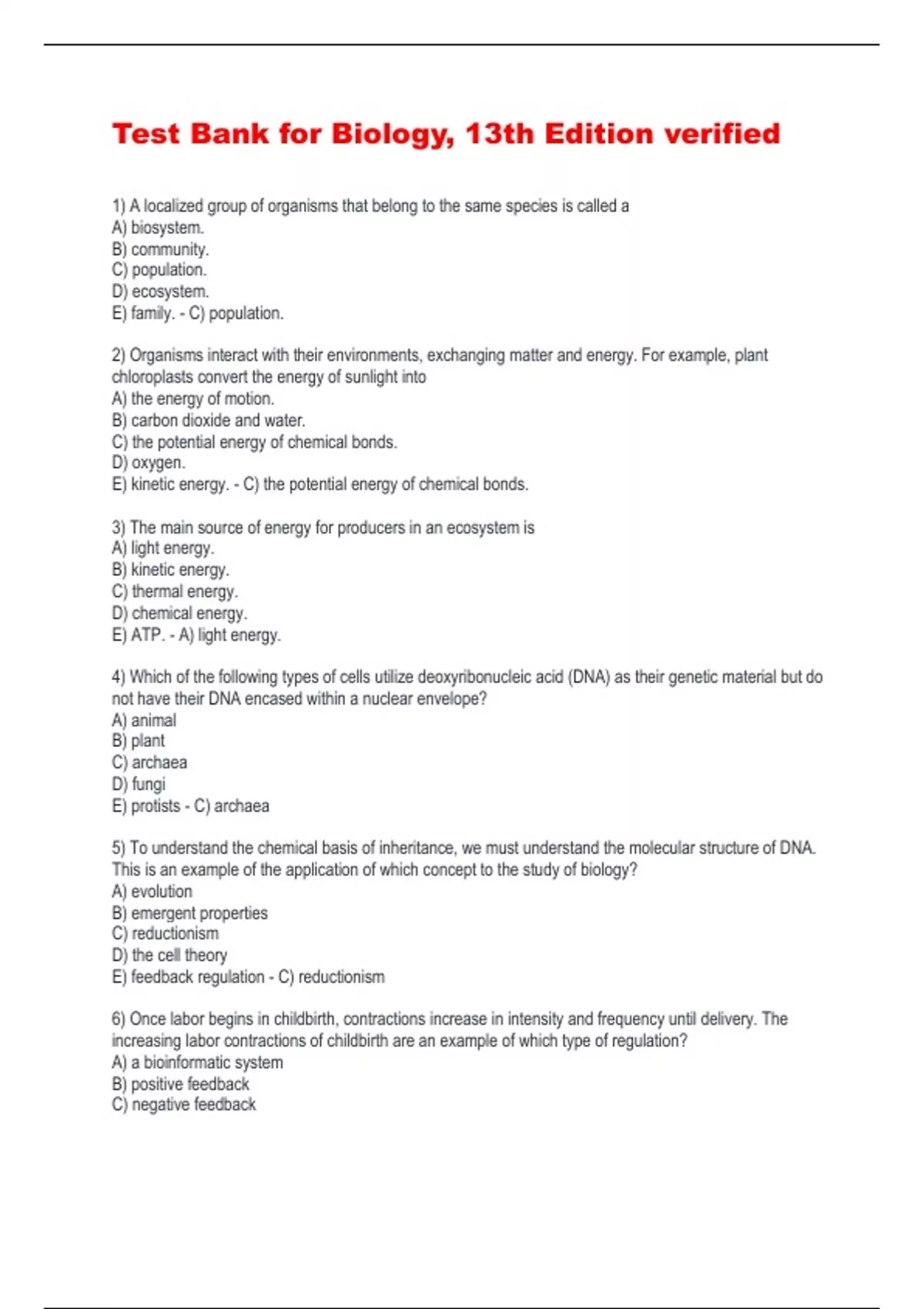 Test Bank for Biology, 13th Edition verified 1) A localized group of organisms that belong to the same species is called a A) biosystem. B) community. C) population. D) ecosystem. E) family. - C) population. 2) Organisms interact with their environments, exchanging matter and energy. For example, plant chloroplasts convert the energy of sunlight into A) the energy of motion. B) carbon dioxide and water. C) the potential energy of chemical bonds. D) oxygen. E) kinetic energy. - C) the potential energy of chemical bonds. 3) The main source of energy for producers in an ecosystem is A) light energy. B) kinetic energy. C) thermal energy. D) chemical energy. E) ATP. - A) light energy. 4) Which of the following types of cells utilize deoxyribonucleic acid (DNA) as their genetic material but do not have their DNA encased within a nuclear envelope? A) animal B) plant C) archaea D) fungi E) protists - C) archaea 5) To understand the chemical basis of inheritance, we must understand the molecular structure of DNA. This is an example of the application of which concept to the study of biology? A) evolution B) emergent properties C) reductionism D) the cell theory E) feedback regulation - C) reductionism