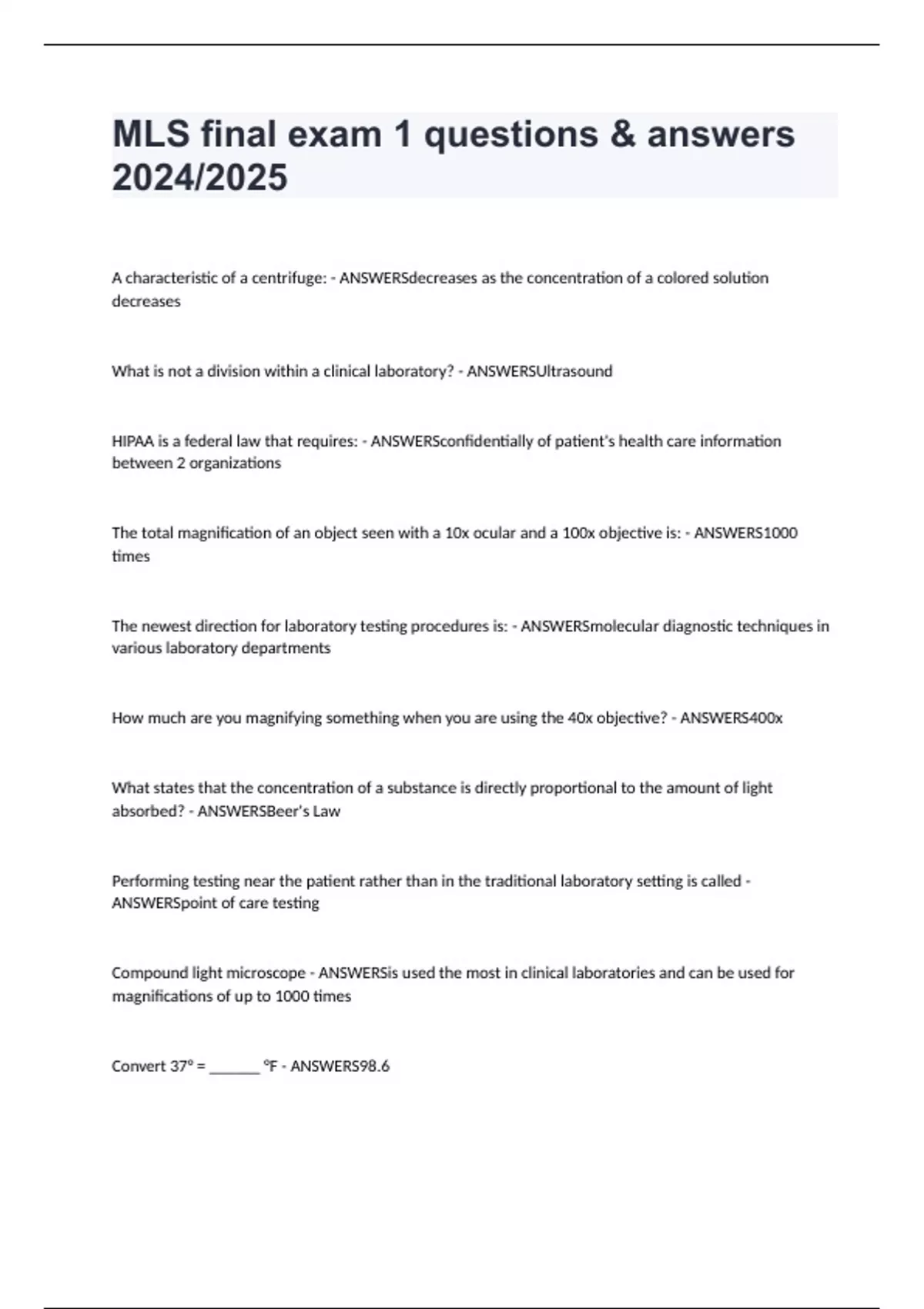 MLS final exam 1 questions & answers 2024/2025 A characteristic of a centrifuge: - ANSWERSdecreases as the concentration of a colored solution decreases What is not a division within a clinical laboratory? - ANSWERSUltrasound HIPAA is a federal law that requires: - ANSWERSconfidentially of patient's health care information between 2 organizations The total magnification of an object seen with a 10x ocular and a 100x objective is: - ANSWERS1000 times The newest direction for laboratory testing procedures is: - ANSWERSmolecular diagnostic techniques in various laboratory departments How much are you magnifying something when you are using the 40x objective? - ANSWERS400x What states that the concentration of a substance is directly proportional to the amount of light absorbed? - ANSWERSBeer's Law Performing testing near the patient rather than in the traditional laboratory setting is called - ANSWERSpoint of care testing Compound light microscope - ANSWERSis used the most in clinical laboratories and can be used for magnifications of up to 1000 times Convert 37° = ______ °F - ANSWERS98.6