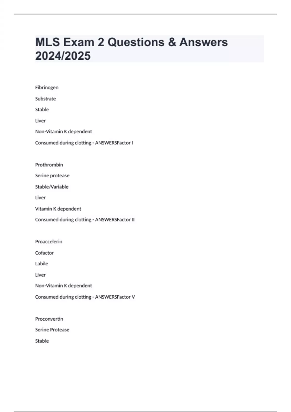 MLS Exam 2 Questions & Answers 2024/2025 Fibrinogen Substrate Stable Liver Non-Vitamin K dependent Consumed during clotting - ANSWERSFactor I Prothrombin Serine protease Stable/Variable Liver Vitamin K dependent Consumed during clotting - ANSWERSFactor II Proaccelerin Cofactor Labile Liver Non-Vitamin K dependent Consumed during clotting - ANSWERSFactor V Proconvertin Serine Protease Stable