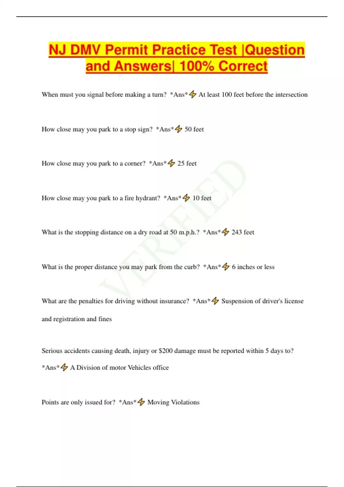 NJ DMV Permit Practice Test |Question and Answers| 100% Correct When must you signal before making a turn? *Ans* At least 100 feet before the intersection How close may you park to a stop sign? *Ans* 50 feet How close may you park to a corner? *Ans* 25 feet How close may you park to a fire hydrant? *Ans* 10 feet What is the stopping distance on a dry road at 50 m.p.h.? *Ans* 243 feet What is the proper distance you may park from the curb? *Ans* 6 inches or less What are the penalties for driving without insurance? *Ans* Suspension of driver's license and registration and fines Serious accidents causing death, injury or $200 damage must be reported within 5 days to? *Ans* A Division of motor Vehicles office Points are only issued for? *Ans* Moving Violations When will you be given a proposed License Suspension Notice? *Ans* After receiving 12 points What is the penalty for driving with a suspended license-first offense? *Ans* Fine of $500 and up to 6 months additional license suspension What is the penalty for not telling the truth when applying for a license? *Ans* No less than a $200 fine and up to 6 months imprisonment Up to 3 points may be subtracted from your record if you receive no moving violations for how long? *Ans* One year What is the penalty for refusing the breath test? *Ans* 6 months suspension (first offense) Who is responsible if a student commits a traffic offense? *Ans* Both the student and the accompanying instructor or licensed driver What should you do if approaching a steady yellow or amber signal? *Ans* Slow down, and stop before entering the intersection only if possible What is a good practice while driving? *Ans* Keep from looking at one thing for more than a few seconds What is the proper lane to turn into when making a left turn? *Ans* The lane nearest the center in the direction you are heading When driving at night you should be able to stop? *Ans* Within the distance you can see ahead Where should you position your car to make a left turn from a two way street? *Ans* The lane nearest the center of the road What is a good practice when nearing an intersection? *Ans* Slow down and be prepared to stop` What is the purpose of traffic laws? *Ans* To protect you and other drivers If there's a "No Turn On Red" sign, when can you make a turn on red? *Ans* Never If you feel or hear unusual thumping noise while driving it may be? *Ans* The tires