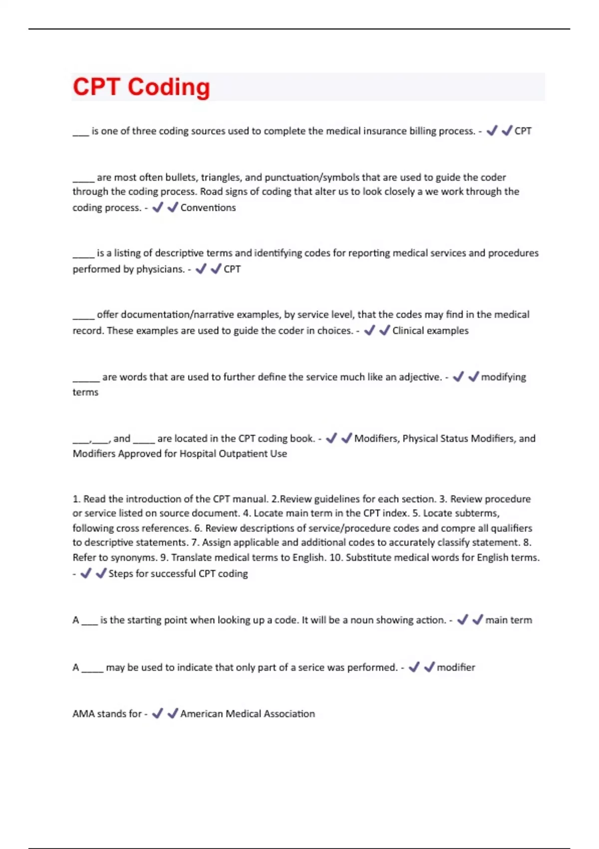 ___ is one of three coding sources used to complete the medical insurance billing process. - CPT ____ are most often bullets, triangles, and punctuation/symbols that are used to guide the coder through the coding process. Road signs of coding that alter us to look closely a we work through the coding process. - Conventions ____ is a listing of descriptive terms and identifying codes for reporting medical services and procedures performed by physicians. - CPT ____ offer documentation/narrative examples, by service level, that the codes may find in the medical record. These examples are used to guide the coder in choices. - Clinical examples _____ are words that are used to further define the service much like an adjective. - modifying terms ___,___, and ____ are located in the CPT coding book. - Modifiers, Physical Status Modifiers, and Modifiers Approved for Hospital Outpatient Use 1. Read the introduction of the CPT manual. 2.Review guidelines for each section. 3. Review procedure or service listed on source document. 4. Locate main term in the CPT index. 5. Locate subterms, following cross references. 6. Review descriptions of service/procedure codes and compre all qualifiers to descriptive statements. 7. Assign applicable and additional codes to accurately classify statement. 8. Refer to synonyms. 9. Translate medical terms to English. 10. Substitute medical words for English terms. - Steps for successful CPT coding A ___ is the starting point when looking up a code. It will be a noun showing action. - main term A ____ may be used to indicate that only part of a serice was performed. - modifier AMA stands for - American Medical AssociationAnesthesia code range - 00100-01999 Coding is organized by ____. - body systems CPT codes are used to report ___, ____, and/or ___ provided by medical professionals. - services, procedures, DME CPT codes have ____ digits codes. - 5 CPT stands for... - Current Procedural Terminology CPTs describe ___ & ___ performed by medical professionals. - services & procedures
