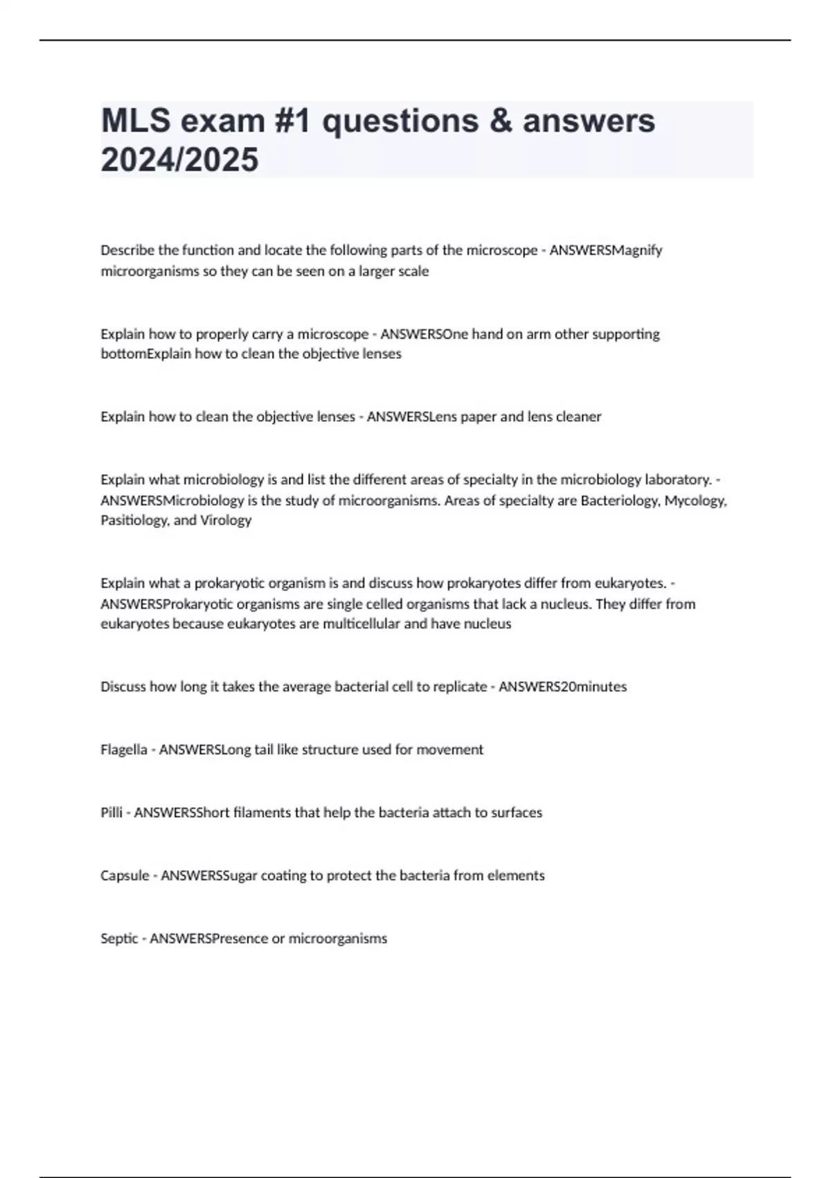 MLS exam #1 questions & answers 2024/2025 Describe the function and locate the following parts of the microscope - ANSWERSMagnify microorganisms so they can be seen on a larger scale Explain how to properly carry a microscope - ANSWERSOne hand on arm other supporting bottomExplain how to clean the objective lenses Explain how to clean the objective lenses - ANSWERSLens paper and lens cleaner Explain what microbiology is and list the different areas of specialty in the microbiology laboratory. - ANSWERSMicrobiology is the study of microorganisms. Areas of specialty are Bacteriology, Mycology, Pasitiology, and Virology Explain what a prokaryotic organism is and discuss how prokaryotes differ from eukaryotes. - ANSWERSProkaryotic organisms are single celled organisms that lack a nucleus. They differ from eukaryotes because eukaryotes are multicellular and have nucleus Discuss how long it takes the average bacterial cell to replicate - ANSWERS20minutes Flagella - ANSWERSLong tail like structure used for movement Pilli - ANSWERSShort filaments that help the bacteria attach to surfaces Capsule - ANSWERSSugar coating to protect the bacteria from elements Septic - ANSWERSPresence or microorganisms