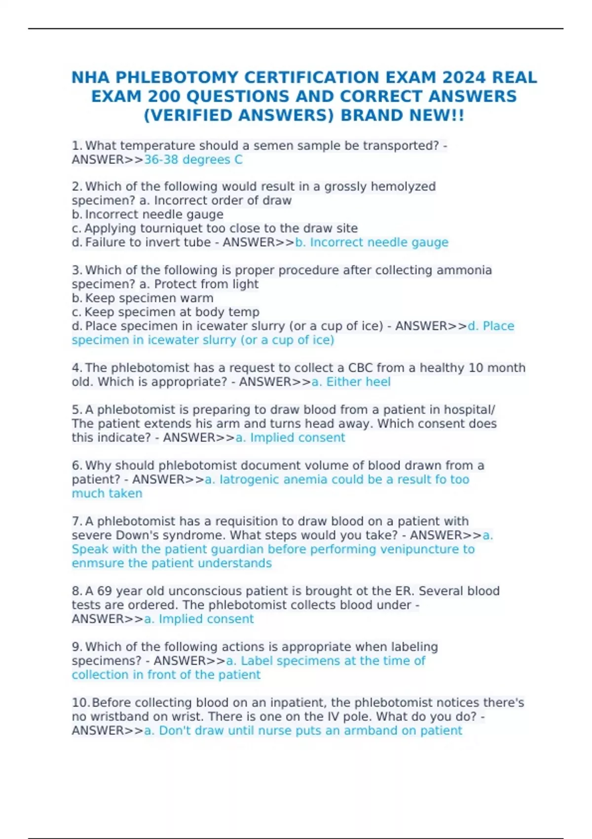 NHA PHLEBOTOMY CERTIFICATION EXAM 2024 REAL EXAM 200 QUESTIONS AND CORRECT ANSWERS (VERIFIED ANSWERS) BRAND NEW!! 1. What temperature should a semen sample be transported? - ANSWER>>36-38 degrees C 2. Which of the following would result in a grossly hemolyzed specimen? a. Incorrect order of draw b. Incorrect needle gauge c. Applying tourniquet too close to the draw site d. Failure to invert tube - ANSWER>>b. Incorrect needle gauge