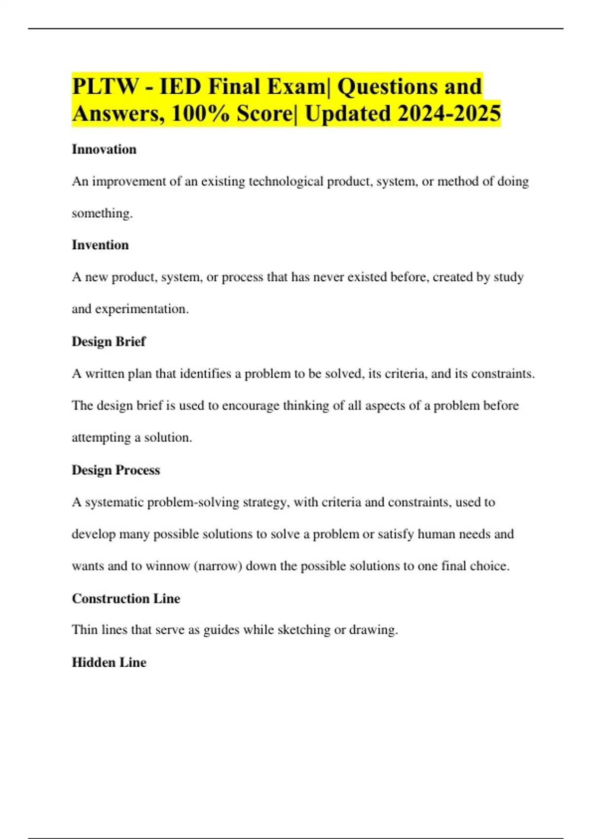PLTW - IED Final Exam| Questions and Answers, 100% Score| Updated Innovation An improvement of an existing technological product, system, or method of doing something. Invention A new product, system, or process that has never existed before, created by study and experimentation. Design Brief A written plan that identifies a problem to be solved, its criteria, and its constraints. The design brief is used to encourage thinking of all aspects of a problem before attempting a solution. Design Process A systematic problem-solving strategy, with criteria and constraints, used to develop many possible solutions to solve a problem or satisfy human needs and wants and to winnow (narrow) down the possible solutions to one final choice. Construction Line Thin lines that serve as guides while sketching or drawing. Hidden Line