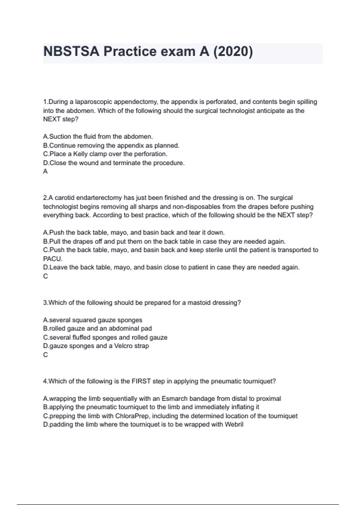 NBSTSA Practice Exam A (2020) Questions And Answers 1.During a laparoscopic appendectomy, the appendix is perforated, and contents begin spilling into the abdomen. Which of the following should the surgical technologist anticipate as the NEXT step? A.Suction the fluid from the abdomen. B.Continue removing the appendix as planned. C.Place a Kelly clamp over the perforation. D.Close the wound and terminate the procedure. A 2.A carotid endarterectomy has just been finished and the dressing is on. The surgical technologist begins removing all sharps and non-disposables from the drapes before pushing everything back. According to best practice, which of the following should be the NEXT step? A.Push the back table, mayo, and basin back and tear it down. B.Pull the drapes off and put them on the back table in case they are needed again. C.Push the back table, mayo, and basin back and keep sterile until the patient is transported to PACU. D.Leave the back table, mayo, and basin close to patient in case they are needed again. C 3.Which of the following should be prepared for a mastoid dressing? A.several squared gauze sponges B.rolled gauze and an abdominal pad C.several fluffed sponges and rolled gauze D.gauze sponges and a Velcro strap C 4.Which of the following is the FIRST step in applying the pneumatic tourniquet? A.wrapping the limb sequentially with an Esmarch bandage from distal to proximal B.applying the pneumatic tourniquet to the limb and immediately inflating it C.prepping the limb with ChloraPrep, including the determined location of the tourniquet D.padding the limb where the tourniquet is to be wrapped with Webril D 5. When performing a dilation and curettage, which of the following instruments is used to grasp the cervix? A.Sims B.Auvard C.Schroeder D. Bozeman C 6. How many lobes do the right and left lungs have, respectively? A.three, two B.two, three C.three, three D.two, two A 7. When a break in aseptic technique occurs, the surgical technologist should FIRST notify the