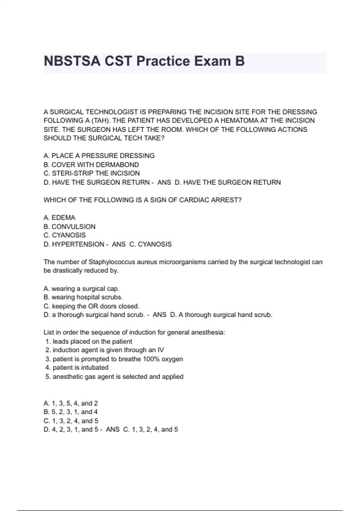 NBSTSA CST Practice Exam B Questions And Answers A SURGICAL TECHNOLOGIST IS PREPARING THE INCISION SITE FOR THE DRESSING FOLLOWING A (TAH). THE PATIENT HAS DEVELOPED A HEMATOMA AT THE INCISION SITE. THE SURGEON HAS LEFT THE ROOM. WHICH OF THE FOLLOWING ACTIONS SHOULD THE SURGICAL TECH TAKE? A. PLACE A PRESSURE DRESSING B. COVER WITH DERMABOND C. STERI-STRIP THE INCISION D. HAVE THE SURGEON RETURN - ANS D. HAVE THE SURGEON RETURN WHICH OF THE FOLLOWING IS A SIGN OF CARDIAC ARREST? A. EDEMA B. CONVULSION C. CYANOSIS D. HYPERTENSION - ANS C. CYANOSIS The number of Staphylococcus aureus microorganisms carried by the surgical technologist can be drastically reduced by. A. wearing a surgical cap. B. wearing hospital scrubs. C. keeping the OR doors closed. D. a thorough surgical hand scrub. - ANS D. A thorough surgical hand scrub. List in order the sequence of induction for general anesthesia: 1. leads placed on the patient 2. induction agent is given through an IV 3. patient is prompted to breathe 100% oxygen 4. patient is intubated 5. anesthetic gas agent is selected and applied A. 1, 3, 5, 4, and 2 B. 5, 2, 3, 1, and 4 C. 1, 3, 2, 4, and 5 D. 4, 2, 3, 1, and 5 - ANS C. 1, 3, 2, 4, and 5 Place the following phases of wound healing by first intention in correct order from first to last: I. proliferation II. remodeling III. inflammatory A. I, II, III B. II, I, III C. III, I, II D. III, II, I - ANS C. III, I, II