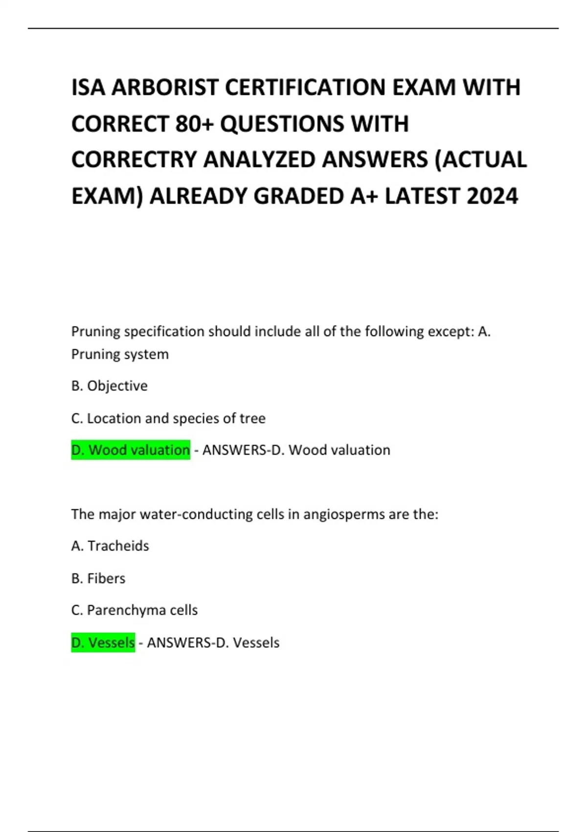 ISA ARBORIST CERTIFICATION EXAM WITH CORRECT 80+ QUESTIONS WITH CORRECTRY ANALYZED ANSWERS (ACTUAL EXAM) ALREADY GRADED A+ LATEST 2024
