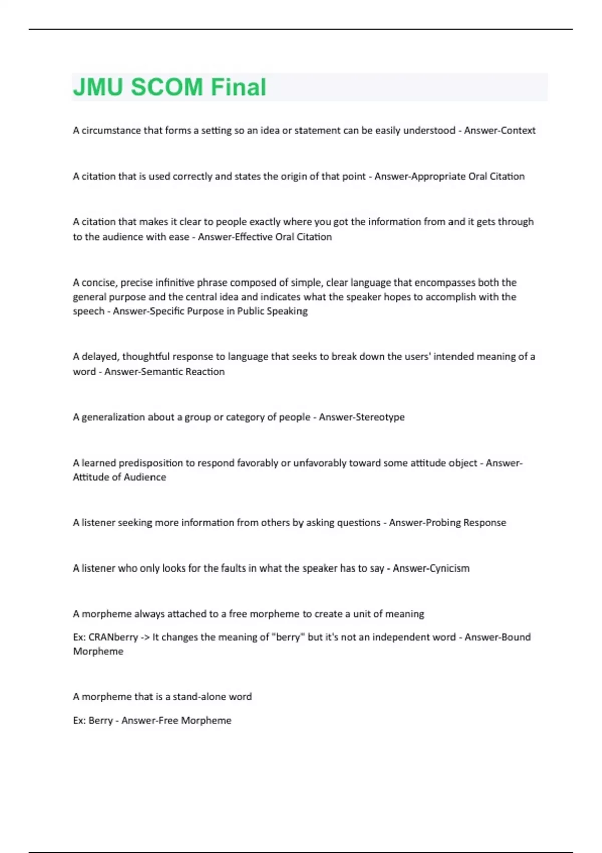 A circumstance that forms a setting so an idea or statement can be easily understood - Answer-Context A citation that is used correctly and states the origin of that point - Answer-Appropriate Oral Citation A citation that makes it clear to people exactly where you got the information from and it gets through to the audience with ease - Answer-Effective Oral Citation A concise, precise infinitive phrase composed of simple, clear language that encompasses both the general purpose and the central idea and indicates what the speaker hopes to accomplish with the speech - Answer-Specific Purpose in Public Speaking A delayed, thoughtful response to language that seeks to break down the users' intended meaning of a word - Answer-Semantic Reaction A generalization about a group or category of people - Answer-Stereotype A learned predisposition to respond favorably or unfavorably toward some attitude object - AnswerAttitude of Audience A listener seeking more information from others by asking questions - Answer-Probing Response A listener who only looks for the faults in what the speaker has to say - Answer-Cynicism A morpheme always attached to a free morpheme to create a unit of meaning Ex: CRANberry -> It changes the meaning of "berry" but it's not an independent word - Answer-Bound Morpheme A morpheme that is a stand-alone word Ex: Berry - Answer-Free MorphemeA part of grammar that describes the patterns of sound in a language - Answer-Phonology A personal attack on the messenger to avoid the message - Answer-Ad Hominem Fallacy A predictable sequence of events that indicates what we are expected to do in a given situation - Answer-Script A predisposition to defend a fixed geographic area, or territory, as one's domain (Ex: Keep out sign on yard) - Answer-Territoriality A social movement that promotes the value of diversity as a core principle and insists that all cultural group be treated with respect and as equals - Answer-Multiculturalism A willingness to accept claims without solid reasoning or valid evidence and to hold these beliefs tenaciously even if a lot of contradictory evidence disputes them - Answer-True belief Ability to create new words - Answer-Productivity Ability to interpret other people's use of language - Answer-Critical Thinking Ability to represent ideas, objects, and events symbollically - Answer-Semanticity Able to rotate/switch and recognize the speaker - Answer-Regulation Acting on an inaccurate expectation that produces the expected behavior and confirms the original impression - Answer-Self-Fulfilling Prophecy Adding emphasis to the situation, using emotion, which enhances the power and seriousness of the verbal message - Answer-AccentuationAdds to the primacy effect which can distort your view of others - Answer-Negativity Bias Basing a claim on popular opinion - Answer-Ad Populum Fallacy Biological influences (Ex: Sweaty palms) - Answer-Physiological Noise Characteristics such as age, gender, culture and ethnicity, and group affiliations - Answer-Demographics of Audience Conclusions about the unknown based on the known like guesses or already known language - AnswerInference Describe how self-concept is formed - Answer-- By what others say about you - How you feel about yourself Describe the listening response styles associated with empathic listening - Answer-Includes supporting and understanding... Focus is put on the speaker which enhances a person's self-esteem and confidence Describe the listening response styles associated with non-empathic listening - Answer-Includes evaluating, advising, interpreting, and content-only... Tend to be disconfirming, so they diminish the person and reduce confidence Describe the skills needed to be an effective and appropriate communicator - Answer-- Progress towards the achievement of their goal - Know that even the best communicators make errors - Communication focuses on the "we" aspect instead of the "me" Engaging in communication with others that is perceived to be both effective and appropriate in a given context - Answer-Communication competenceEnthusiasm, energy, and forcefulness - Answer-Dynamism Everyone's worldview defines their interpretation of events - Answer-Subjectivity