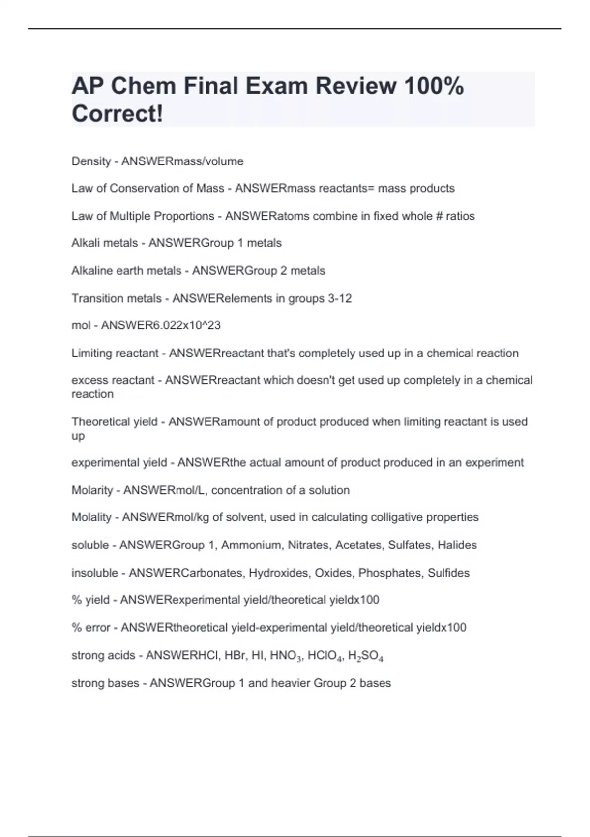 Density - ANSWERmass/volume Law of Conservation of Mass - ANSWERmass reactants= mass products Law of Multiple Proportions - ANSWERatoms combine in fixed whole # ratios Alkali metals - ANSWERGroup 1 metals Alkaline earth metals - ANSWERGroup 2 metals Transition metals - ANSWERelements in groups 3-12 mol - ANSWER6.022x10^23 Limiting reactant - ANSWERreactant that's completely used up in a chemical reaction excess reactant - ANSWERreactant which doesn't get used up completely in a chemical reaction Theoretical yield - ANSWERamount of product produced when limiting reactant is used up experimental yield - ANSWERthe actual amount of product produced in an experiment Molarity - ANSWERmol/L, concentration of a solution Molality - ANSWERmol/kg of solvent, used in calculating colligative properties soluble - ANSWERGroup 1, Ammonium, Nitrates, Acetates, Sulfates, Halides insoluble - ANSWERCarbonates, Hydroxides, Oxides, Phosphates, Sulfides % yield - ANSWERexperimental yield/theoretical yieldx100 % error - ANSWERtheoretical yield-experimental yield/theoretical yieldx100 strong acids - ANSWERHCl, HBr, HI, HNO₃, HClO₄, H₂SO₄