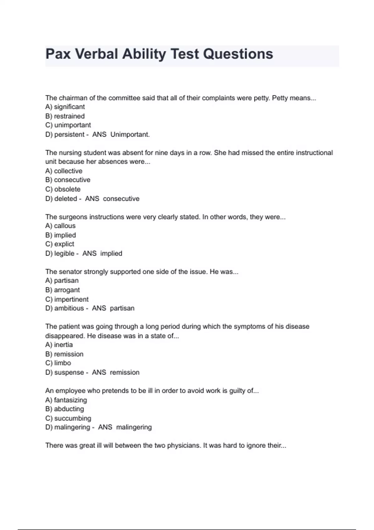 Pax Verbal Ability Test Questions And Answers The chairman of the committee said that all of their complaints were petty. Petty means... A) significant B) restrained C) unimportant D) persistent - ANS Unimportant. The nursing student was absent for nine days in a row. She had missed the entire instructional unit because her absences were... A) collective B) consecutive C) obsolete D) deleted - ANS consecutive The surgeons instructions were very clearly stated. In other words, they were... A) callous B) implied C) explict D) legible - ANS implied The senator strongly supported one side of the issue. He was... A) partisan B) arrogant C) impertinent D) ambitious - ANS partisan The patient was going through a long period during which the symptoms of his disease disappeared. He disease was in a state of... A) inertia B) remission C) limbo D) suspense - ANS remission An employee who pretends to be ill in order to avoid work is guilty of... A) fantasizing B) abducting C) succumbing D) malingering - ANS malingering There was great ill will between the two physicians. It was hard to ignore their... A) avarice B) animosity C) admonition D) veneration - ANS animosity The aide was given work regarded as low or degrading. These tasks could be considered... A) menial B) obscure C) contemptible D) nominal - ANS menial The mayors comments were always honest and open. For this reason, reporters felt that his interviews were... A) cynical B) eloquent C) candid D) casual - ANS candid The medical and nursing staffs participated in the conference organized to discuss hospital policy. They took part in a... A) continuum B) momentum C) symposium D) pandemonium - ANS symposium The animal ate both meat and plants. It was a... A) carnivore B) omnivore