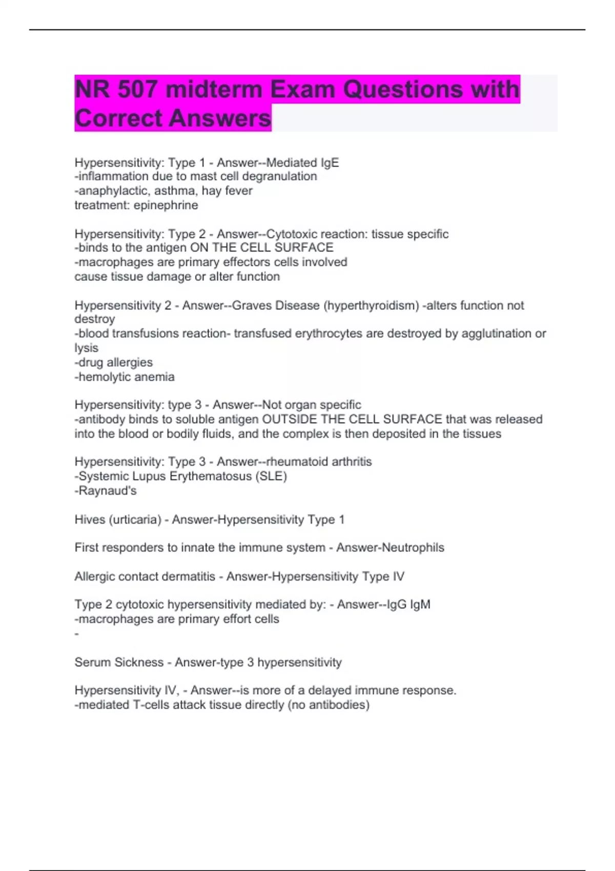 Hypersensitivity: Type 1 - Answer--Mediated IgE -inflammation due to mast cell degranulation -anaphylactic, asthma, hay fever treatment: epinephrine Hypersensitivity: Type 2 - Answer--Cytotoxic reaction: tissue specific -binds to the antigen ON THE CELL SURFACE -macrophages are primary effectors cells involved cause tissue damage or alter function Hypersensitivity 2 - Answer--Graves Disease (hyperthyroidism) -alters function not destroy -blood transfusions reaction- transfused erythrocytes are destroyed by agglutination or lysis -drug allergies -hemolytic anemia Hypersensitivity: type 3 - Answer--Not organ specific -antibody binds to soluble antigen OUTSIDE THE CELL SURFACE that was released into the blood or bodily fluids, and the complex is then deposited in the tissues Hypersensitivity: Type 3 - Answer--rheumatoid arthritis -Systemic Lupus Erythematosus (SLE) -Raynaud's Hives (urticaria) - Answer-Hypersensitivity Type 1 First responders to innate the immune system - Answer-Neutrophils Allergic contact dermatitis - Answer-Hypersensitivity Type IV Type 2 cytotoxic hypersensitivity mediated by: - Answer--IgG IgM -macrophages are primary effort cells - Serum Sickness - Answer-type 3 hypersensitivity Hypersensitivity IV, - Answer--is more of a delayed immune response. -mediated T-cells attack tissue directly (no antibodies)