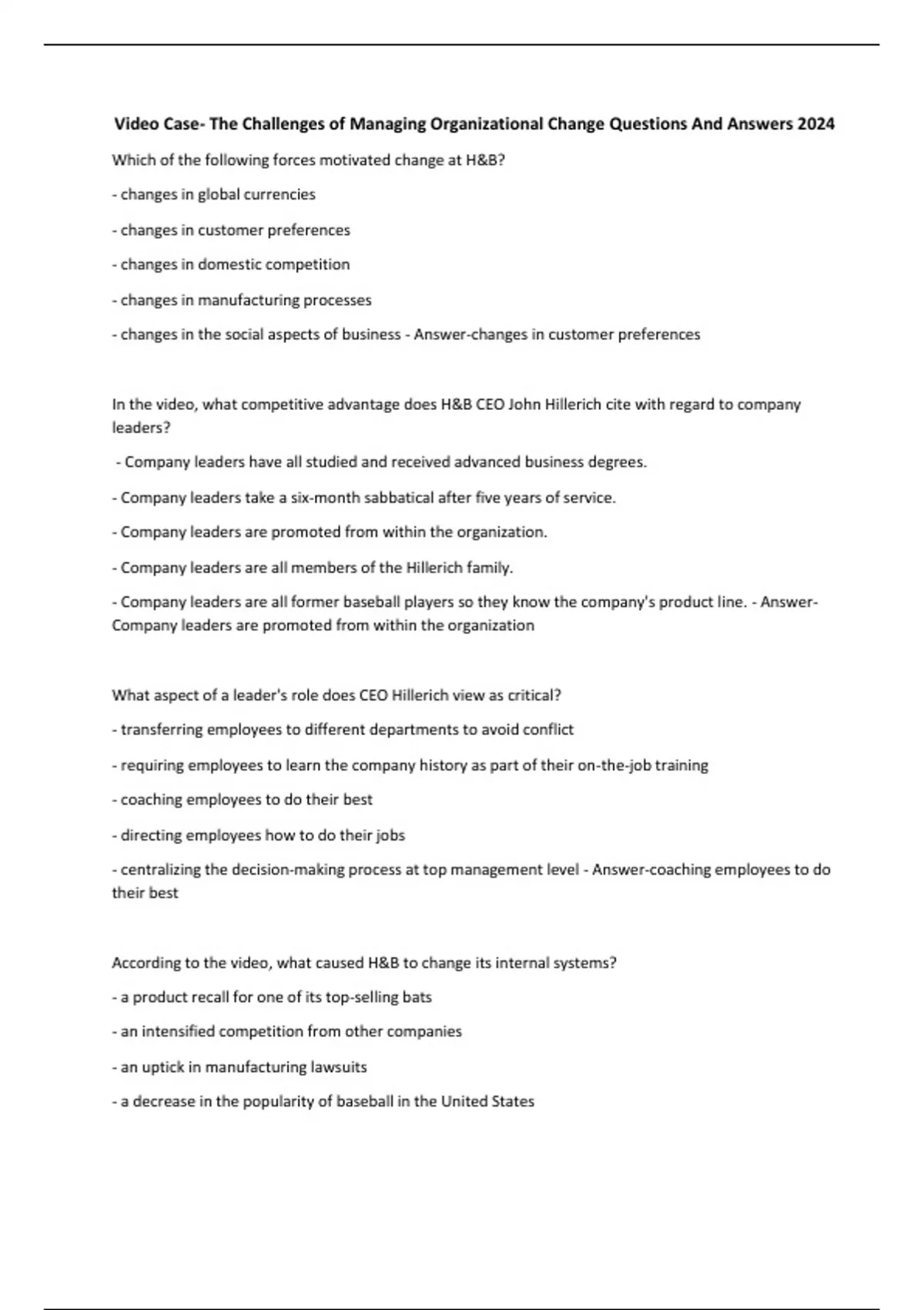 Video Case- The Challenges of Managing Organizational Change Questions And Answers 2024 Which of the following forces motivated change at H&B? - changes in global currencies - changes in customer preferences - changes in domestic competition - changes in manufacturing processes - changes in the social aspects of business - Answer-changes in customer preferences In the video, what competitive advantage does H&B CEO John Hillerich cite with regard to company leaders? - Company leaders have all studied and received advanced business degrees. - Company leaders take a six-month sabbatical after five years of service. - Company leaders are promoted from within the organization. - Company leaders are all members of the Hillerich family. - Company leaders are all former baseball players so they know the company's product line. - AnswerCompany leaders are promoted from within the organization What aspect of a leader's role does CEO Hillerich view as critical?