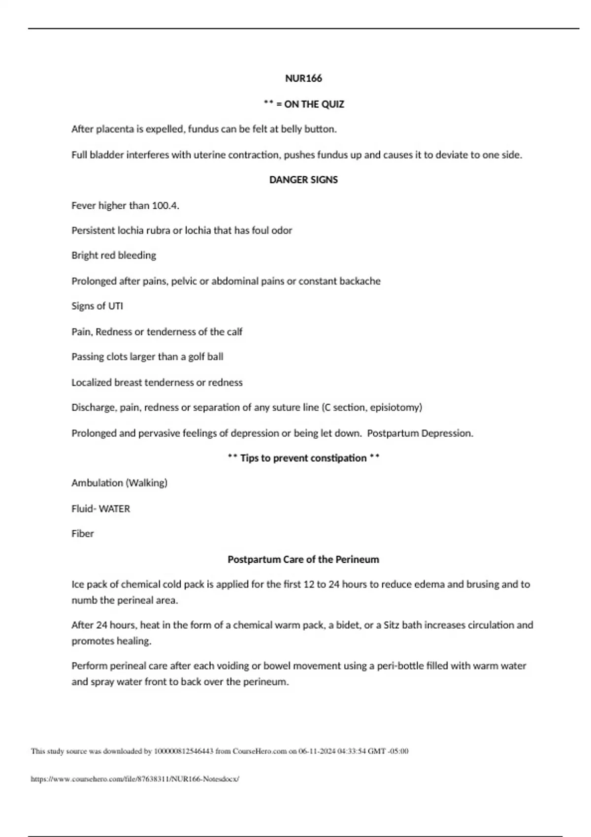 NUR166 ** = ON THE QUIZ After placenta is expelled, fundus can be felt at belly button. Full bladder interferes with uterine contraction, pushes fundus up and causes it to deviate to one side. DANGER SIGNS Fever higher than 100.4. Persistent lochia rubra or lochia that has foul odor Bright red bleeding Prolonged after pains, pelvic or abdominal pains or constant backache Signs of UTI Pain, Redness or tenderness of the calf Passing clots larger than a golf ball Localized breast tenderness or redness Discharge, pain, redness or separ