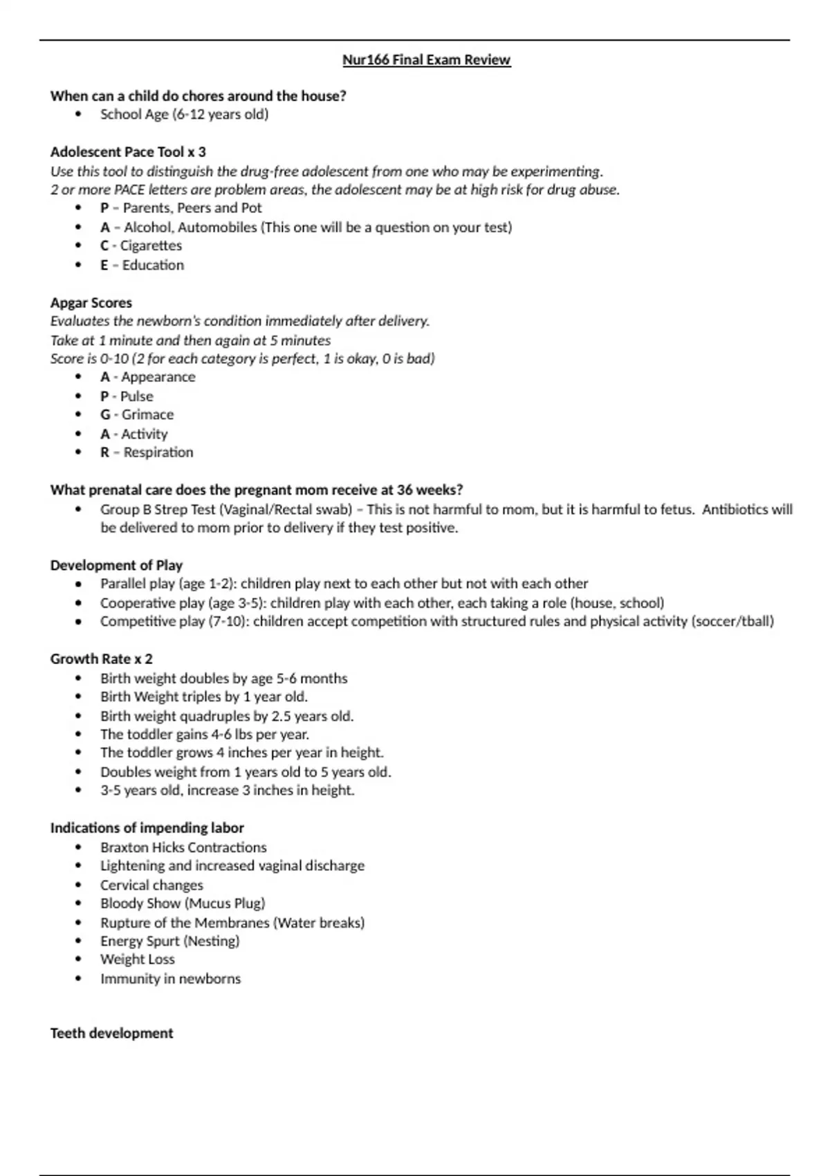 Nur166 Final Exam Review When can a child do chores around the house?School Age (6-12 years old)Adolescent Pace Tool x 3Use this tool to distinguish the drug-free adolescent from one who may be experimenting.2 or more PACE letters are problem areas, the adolescent may be at high risk for drug abuse.P– Parents, Peers and PotA– Alcohol, Automobiles (This one will be a question on your test)C- CigarettesE– EducationApgar ScoresEvaluates the newborn’s condition immediately after delivery.Take at 1 minute and then again at 5 minutesScore is 0-10 (2 for ea