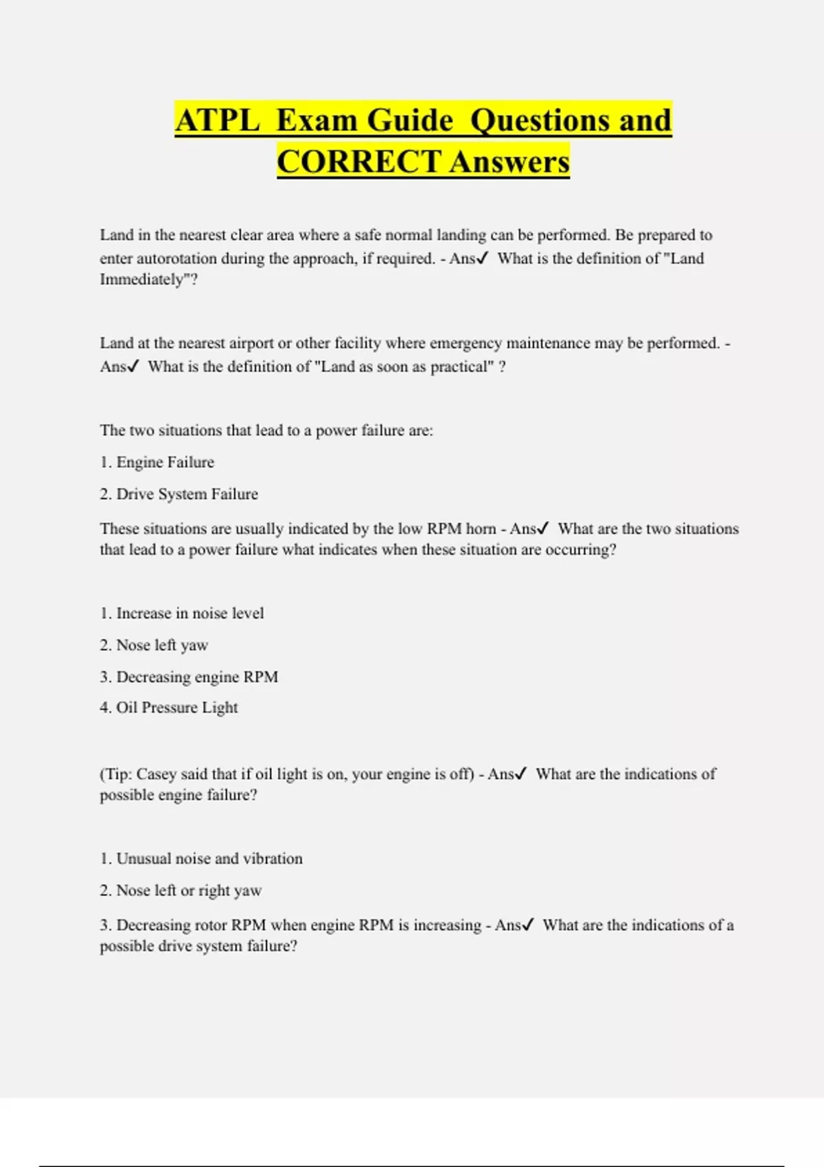 ATPL Exam Guide Questions and CORRECT Answers Land in the nearest clear area where a safe normal landing can be performed. Be prepared to enter autorotation during the approach, if required. - Ans What is the definition of "Land Immediately"? Land at the nearest airport or other facility where emergency maintenance may be performed. - Ans What is the definition of "Land as soon as practical" ? The two situations that lead to a power failure are: 1. Engine Failure 2. Drive System Failure These situations are usually indicated by the low RPM horn - Ans What are the two situations that lead to a power failure what indicates when these situation are occurring?