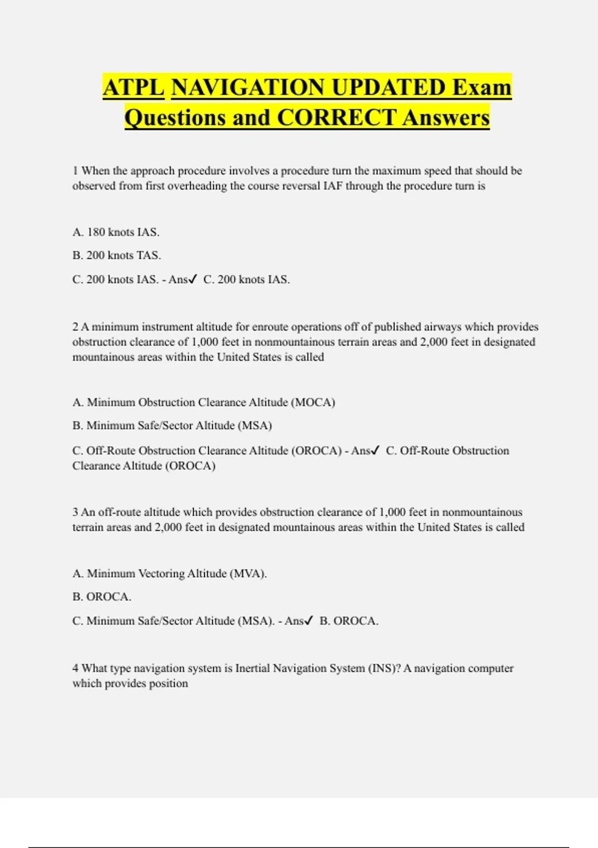 ATPL NAVIGATION UPDATED Exam Questions and CORRECT Answers 1 When the approach procedure involves a procedure turn the maximum speed that should be observed from first overheading the course reversal IAF through the procedure turn is A. 180 knots IAS. B. 200 knots TAS. C. 200 knots IAS. - Ans C. 200 knots IAS. 2 A minimum instrument altitude for enroute operations off of published airways which provides obstruction clearance of 1,000 feet in nonmountainous terrain areas and 2,000 feet in designated mountainous areas within the United States is called