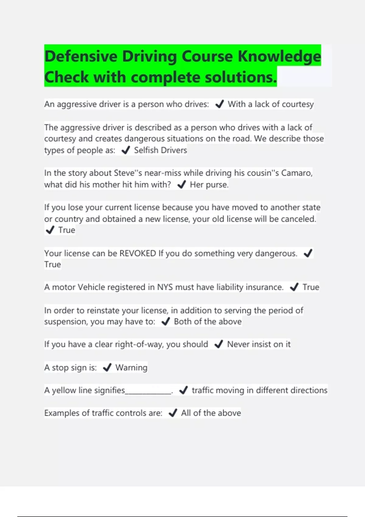 Defensive Driving Course Knowledge Check with complete solutions. An aggressive driver is a person who drives: ️ With a lack of courtesy The aggressive driver is described as a person who drives with a lack of courtesy and creates dangerous situations on the road. We describe those types of people as: ️ Selfish Drivers In the story about Steve''s near-miss while driving his cousin''s Camaro, what did his mother hit him with? ️ Her purse. If you lose your current license because you have moved to another state or country and obtained a new license, your old license will be canceled. ️ True Your license can be REVOKED If you do something very dangerous. ️ True A motor Vehicle registered in NYS must have liability insurance. ️ True In order to reinstate your license, in addition to serving the period of suspension, you may have to: ️ Both of the above If you have a clear right-of-way, you should ️ Never insist on it A stop sign is: ️ Warning A yellow line signifies_____________. ️ traffic moving in different directions Examples of traffic controls are: ️ All of the above