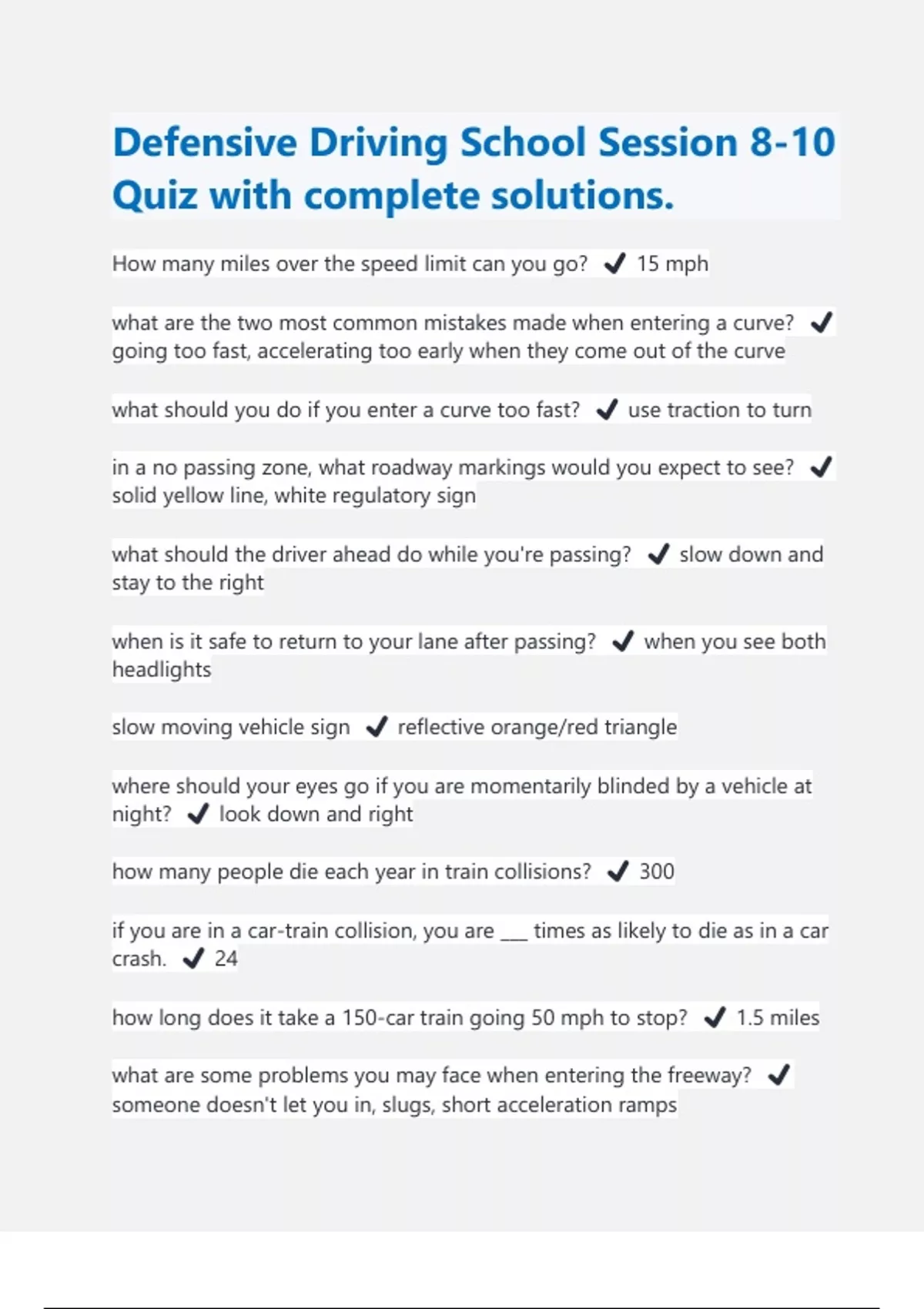 Defensive Driving School Session 8-10 Quiz with complete solutions. How many miles over the speed limit can you go? ️ 15 mph what are the two most common mistakes made when entering a curve? ️ going too fast, accelerating too early when they come out of the curve what should you do if you enter a curve too fast? ️ use traction to turn in a no passing zone, what roadway markings would you expect to see? ️ solid yellow line, white regulatory sign what should the driver ahead do while you're passing? ️ slow down and stay to the right when is it safe to return to your lane after passing? ️ when you see both headlights slow moving vehicle sign ️ reflective orange/red triangle where should your eyes go if you are momentarily blinded by a vehicle at night? ️ look down and right how many people die each year in train collisions? ️ 300 if you are in a car-train collision, you are ___ times as likely to die as in a car crash. ️ 24