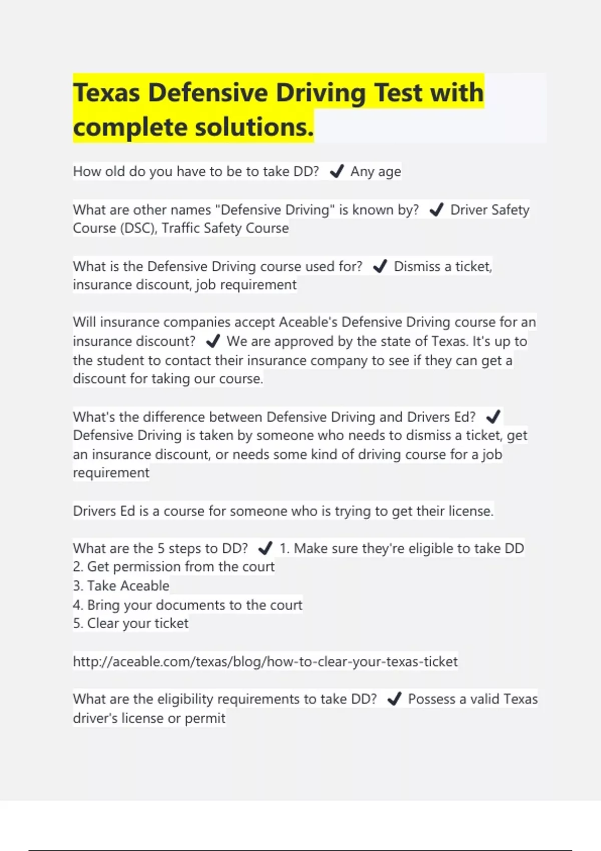 Texas Defensive Driving Test with complete solutions. How old do you have to be to take DD? ️ Any age What are other names "Defensive Driving" is known by? ️ Driver Safety Course (DSC), Traffic Safety Course What is the Defensive Driving course used for? ️ Dismiss a ticket, insurance discount, job requirement Will insurance companies accept Aceable's Defensive Driving course for an insurance discount? ️ We are approved by the state of Texas. It's up to the student to contact their insurance company to see if they can get a discount for taking our course. What's the difference between Defensive Driving and Drivers Ed? ️ Defensive Driving is taken by someone who needs to dismiss a ticket, get an insurance discount, or needs some kind of driving course for a job requirement Drivers Ed is a course for someone who is trying to get their license. What are the 5 steps to DD? ️ 1. Make sure they're eligible to take DD 2. Get permission from the court 3. Take Aceable 4. Bring your documents to the court 5. Clear your ticket What are the eligibility requirements to take DD? ️ Possess a valid Texas driver's license or permit