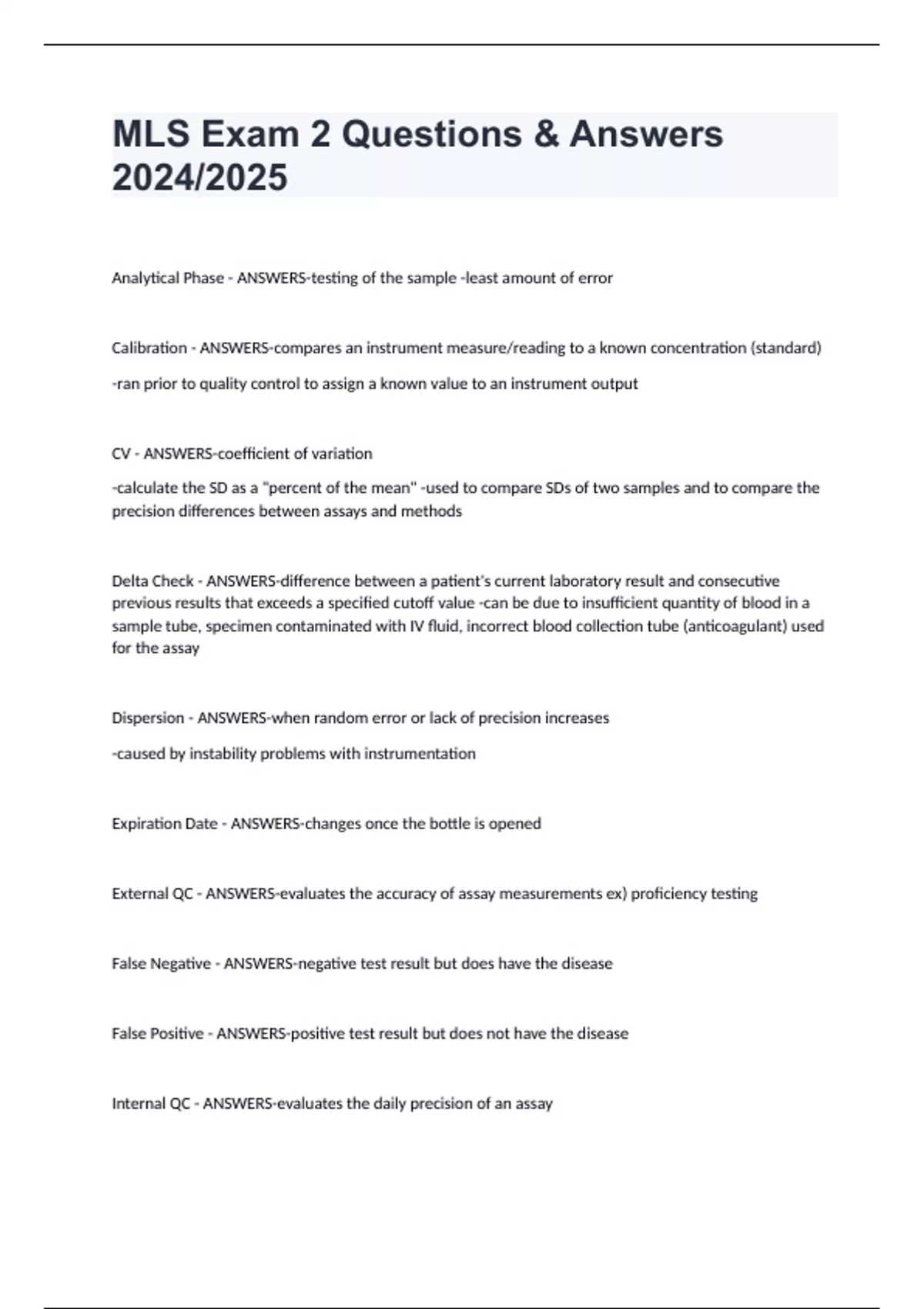 MLS Exam 2 Questions & Answers 2024/2025 Analytical Phase - ANSWERS-testing of the sample -least amount of error Calibration - ANSWERS-compares an instrument measure/reading to a known concentration (standard) -ran prior to quality control to assign a known value to an instrument output CV - ANSWERS-coefficient of variation -calculate the SD as a "percent of the mean" -used to compare SDs of two samples and to compare the precision differences between assays and methods Delta Check - ANSWERS-difference between a patient's current laboratory result and consecutive previous results that exceeds a specified cutoff value -can be due to insufficient quantity of blood in a sample tube, specimen contaminated with IV fluid, incorrect blood collection tube (anticoagulant) used for the assay Dispersion - ANSWERS-when random error or lack of precision increases -caused by instability problems with instrumentation Expiration Date - ANSWERS-changes once the bottle is opened External QC - ANSWERS-evaluates the accuracy of assay measurements ex) proficiency testing False Negative - ANSWERS-negative test result but does have the disease False Positive - ANSWERS-positive test result but does not have the disease Internal QC - ANSWERS-evaluates the daily precision of an assay