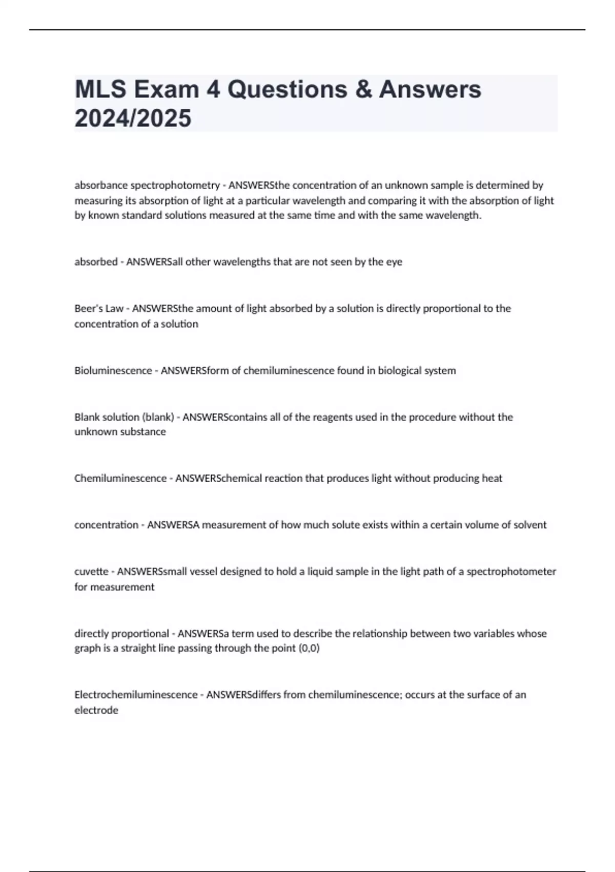 MLS Exam 4 Questions & Answers 2024/2025 absorbance spectrophotometry - ANSWERSthe concentration of an unknown sample is determined by measuring its absorption of light at a particular wavelength and comparing it with the absorption of light by known standard solutions measured at the same time and with the same wavelength. absorbed - ANSWERSall other wavelengths that are not seen by the eye Beer's Law - ANSWERSthe amount of light absorbed by a solution is directly proportional to the concentration of a solution Bioluminescence - ANSWERSform of chemiluminescence found in biological system Blank solution (blank) - ANSWERScontains all of the reagents used in the procedure without the unknown substance Chemiluminescence - ANSWERSchemical reaction that produces light without producing heat concentration - ANSWERSA measurement of how much solute exists within a certain volume of solvent cuvette - ANSWERSsmall vessel designed to hold a liquid sample in the light path of a spectrophotometer for measurement directly proportional - ANSWERSa term used to describe the relationship between two variables whose graph is a straight line passing through the point (0,0) Electrochemiluminescence - ANSWERSdiffers from chemiluminescence; occurs at the surface of an electrode
