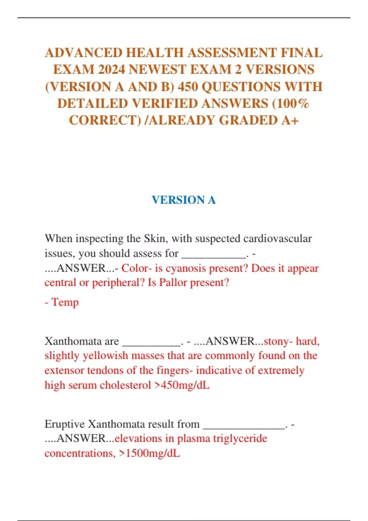 ADVANCED HEALTH ASSESSMENT FINAL EXAM 2024 NEWEST EXAM 2 VERSIONS (VERSION A AND B) 450 QUESTIONS WITH DETAILED VERIFIED ANSWERS (100% CORRECT) /ALREADY GRADED A+ VERSION A When inspecting the Skin, with suspected cardiovascular issues, you should assess for ___________. - ....ANSWER...- Color- is cyanosis present? Does it appear central or peripheral? Is Pallor present? - Temp Xanthomata are __________. - ....ANSWER...stony- hard, slightly yellowish masses that are commonly found on the extensor tendons of the fingers- indicative of extremely high serum cholesterol >450mg/dL Eruptive Xanthomata result from ______________. - ....ANSWER...elevations in plasma triglyceride concentrations, >1500mg/dL When assessing the Nails, with suspected cardiovascular issues, you should assess for ___________. - ....ANSWER...Splinter hemorrhages: visible, small reddish-brown lines in the nail bed. classically associated with infective endocarditis. - Lichstein's sign is ____________. - ....ANSWER...(not reliable -beware false + or -): Earlobe crease; is an oblique crease, often bilateral, seen frequently in patients older than 50 yrs with significant CHD Arcus senilis, if found in patients younger than 40 years old may be due to - ....ANSWER...-hypercholesterolemia What does Arcus senilis look like? - ....ANSWER...a whitish ring at the perimeter of the cornea. Xanthelasma is __________ and is due to possible _______________. - ....ANSWER...- the presence of yellowish plaques on the eyelids. - hyperlipoproteinemia Hypertelorism is ___________ and is often associated with ____________. - ....ANSWER...- widely set eyes - congenital heart problems such as mitral valve prolapse. When cardiovascular issues are suspected, a high-arched palate may be associated with ________________. - ....ANSWER...congenital heart problems such as mitral valve prolapse. Palatal petechiae is often associated with ___________________. - ....ANSWER...infective endocarditis. Webbing of neck, as seen in individuals with Turners syndrome and in patients with Noonan's syndrome, may be due to _______________. - ....ANSWER...coarctation of the aorta. Pectus excavatum is ______________ . - ....ANSWER...caved in chest Pectus carinatum is _______________. - ....ANSWER...pigeon breast