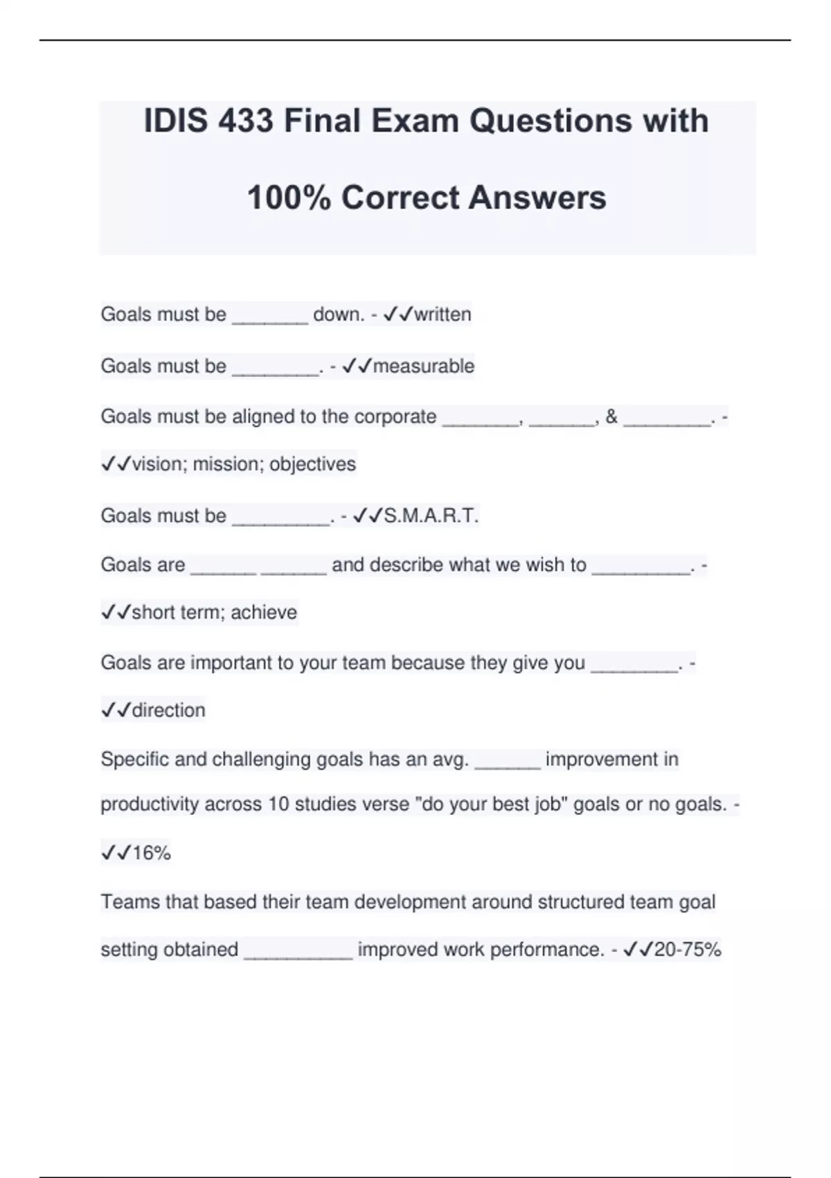 IDIS 433 Final Exam Questions with 100% Correct Answers Goals must be _______ down. - written Goals must be ________. - measurable Goals must be aligned to the corporate _______, ______, & ________. - vision; mission; objectives Goals must be _________. - S.M.A.R.T. Goals are ______ ______ and describe what we wish to _________. - short term; achieve Goals are important to your team because they give you ________. - direction Specific and challenging goals has an avg. ______ improvement in productivity across 10 studies verse "do your best job" goals or no goals. - 16% Teams that based their team development around structured team goal setting obtained __________ improved work performance. - 20-75%