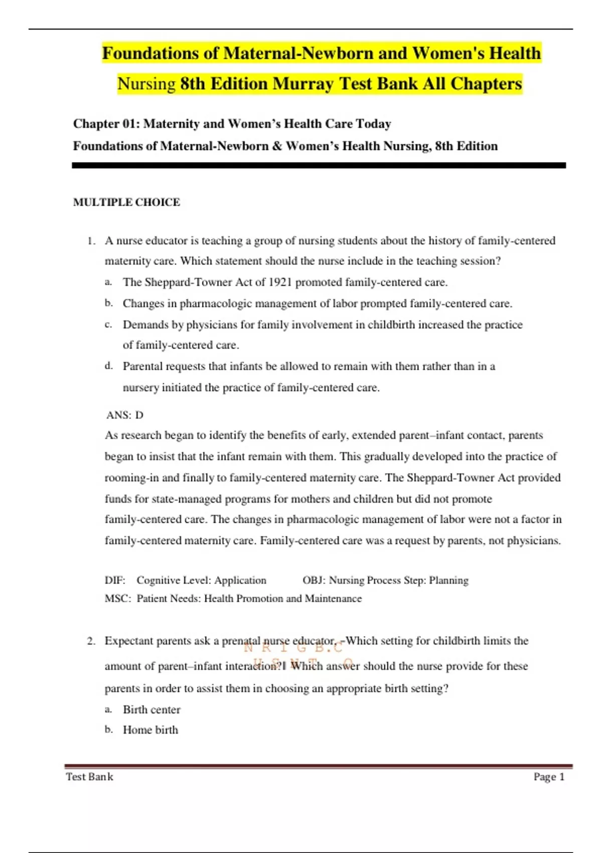 1. A nurse educator is teaching a group of nursing students about the history of family-centered maternity care. Which statement should the nurse include in the teaching session? a. The Sheppard-Towner Act of 1921 promoted family-centered care. b. Changes in pharmacologic management of labor prompted family-centered care. c. Demands by physicians for family involvement in childbirth increased the practice of family-centered care. d. Parental requests that infants be allowed to remain with them rather than in a nursery initiated the practice of family-centered care. ANS: D As research began to identify the benefits of early, extended parent–infant contact, parents began to insist that the infant remain with them. This gradually developed into the practice of rooming-in and finally to family-centered maternity care. The Sheppard-Towner Act provided funds for state-managed programs for mothers and children but did not promote family-centered care. The changes in pharmacologic management of labor were not a factor in family-centered maternity care. Family-centered care was a request by parents, not physicians. DIF: Cognitive Level: Application OBJ: Nursing Process Step: Planning MSC: Patient Needs: Health Promotion and Maintenance 2. Expectant parents ask a prenaN talR nurI se eG ducB at. orC , ―Which setting for childbirth limits the amount of parent–infant interacUtionS?‖NWhTich answOer should the nurse provide for these parents in order to assist them in choosing an appropriate birth setting? a. Birth center b. Home birth Test Bank Page 2 c. Traditional hospital birth d. Labor, birth, and recovery room ANS: C In the traditional hospital setting, the mother may see the infant for only short feeding periods, and the infant is cared for in a separate nursery. Birth centers are set up to allow an increase in parent–infant contact. Home births allow the greatest amount of parent–infant contact. The labor, birth, recovery, and postpartum room setting allows for increased parent–infant contact. DIF: Cognitive Level: Understanding OBJ: Nursing Process Step: Planning MSC: Patient Needs: Health Promotion and Maintenance 3. Which statement best describes the advantage of a labor, birth, recovery, and postpartum (LDRP) room? a. The family is in a familiar environment. b. They are less expensive than traditional hospital rooms. c. The infant is removed to the nursery to allow the mother to rest. d. The woman‘s support system is encouraged to stay until discharge. ANS: D Sleeping equipment is provided in a private room. A hospital setting is never a familiar environment to new parents. An LDRP room is not less expensive than a traditional hospital room. The baby remains with the mother at all times and is not removed to the nursery for routine care or testing. The father or other designated members of the mother‘s support system are encouraged to stay at all times.