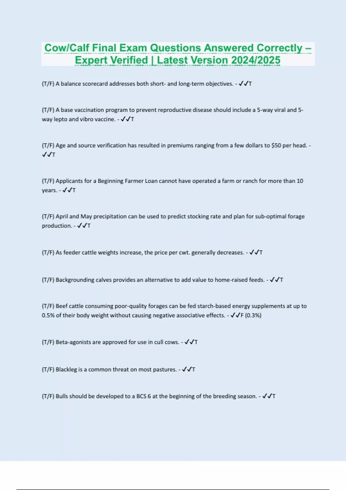 Cow/Calf Final Exam Questions Answered Correctly – Expert Verified | Latest Version 2024/2025