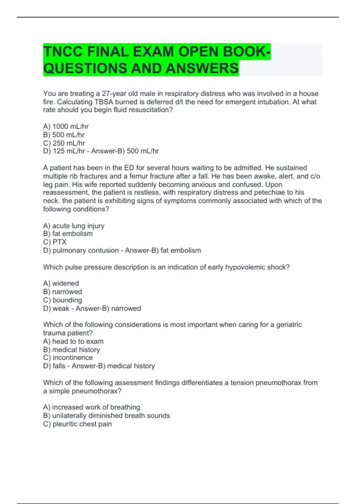 TNCC FINAL EXAM OPEN BOOK- QUESTIONS AND ANSWERS