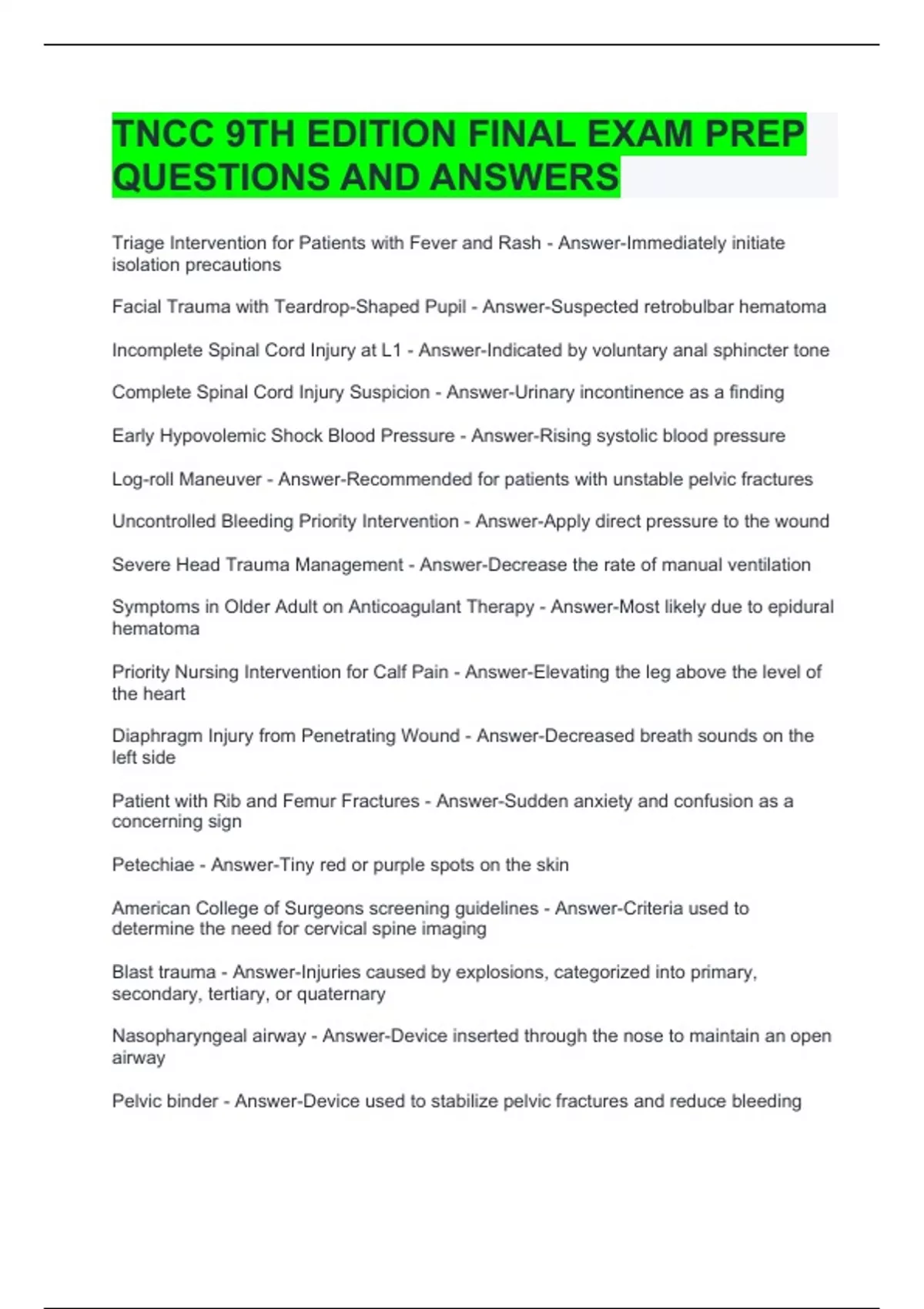 TNCC 9TH EDITION FINAL EXAM PREP QUESTIONS AND ANSWERS