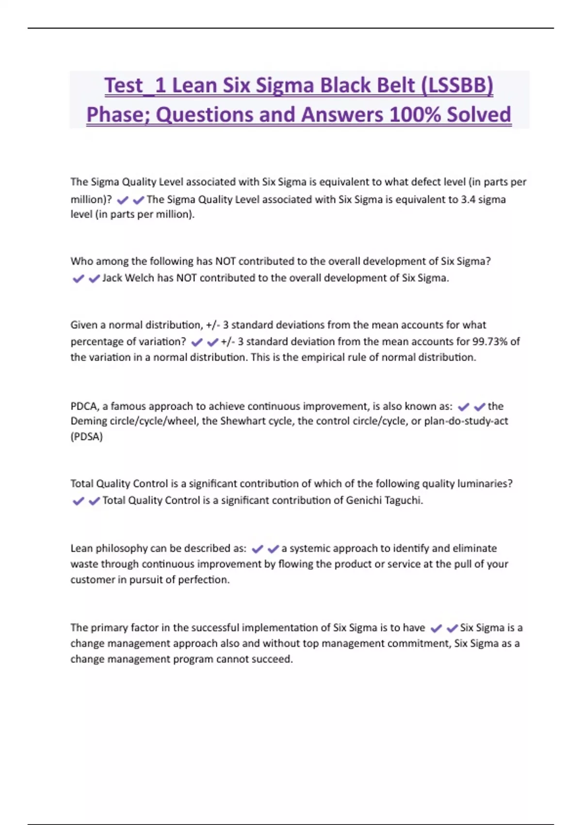 Test_1 Lean Six Sigma Black Belt (LSSBB) Phase; Questions and Answers 100% Solved The Sigma Quality Level associated with Six Sigma is equivalent to what defect level (in parts per million)? The Sigma Quality Level associated with Six Sigma is equivalent to 3.4 sigma level (in parts per million). Who among the following has NOT contributed to the overall development of Six Sigma? Jack Welch has NOT contributed to the overall development of Six Sigma. Given a normal distribution, +/- 3 standard deviations from the mean accounts for what percentage of variation? +/- 3 standard deviation from the mean accounts for 99.73% of the variation in a normal distribution. This is the empirical rule of normal distribution
