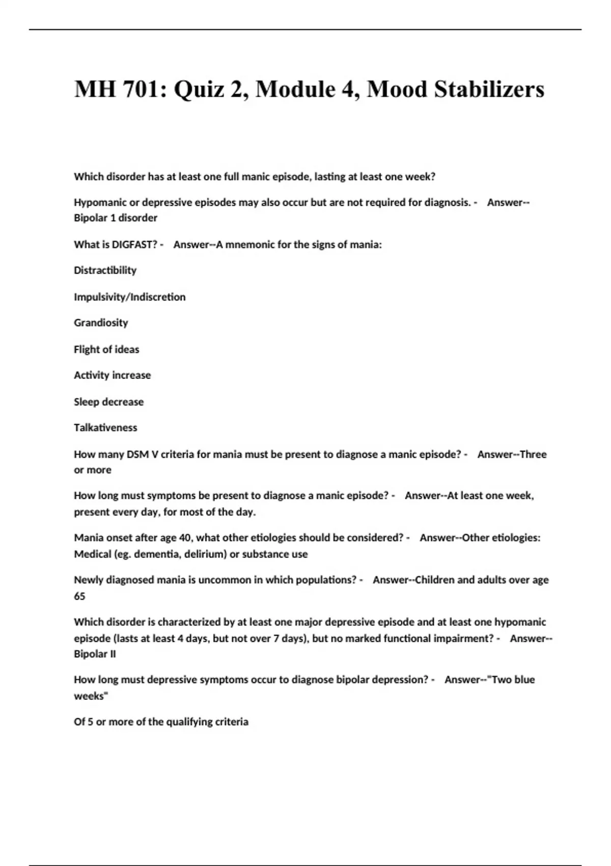 MH 701 Quiz 2, Module 4, Mood Stabilizers.