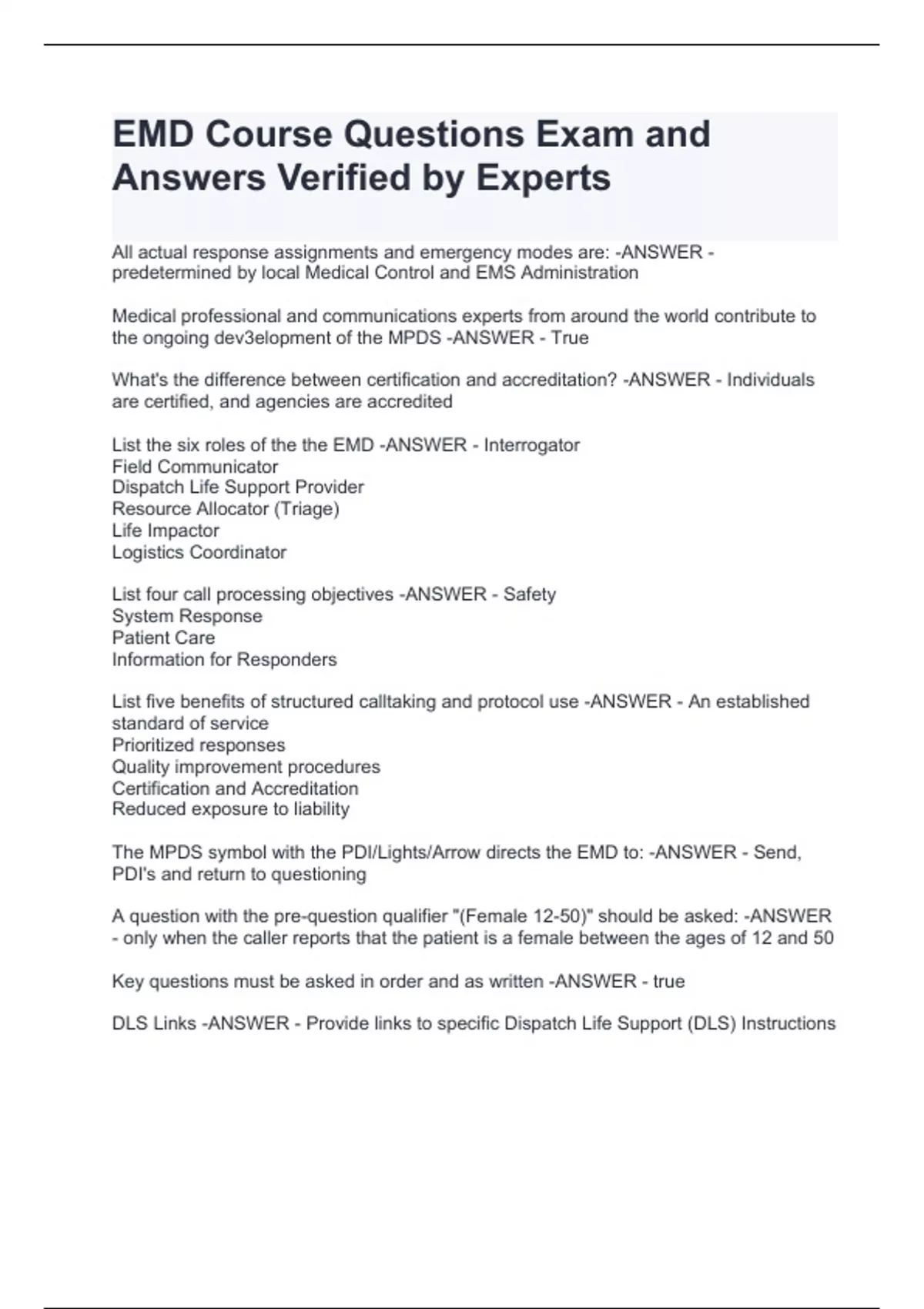All actual response assignments and emergency modes are: -ANSWER - predetermined by local Medical Control and EMS Administration Medical professional and communications experts from around the world contribute to the ongoing dev3elopment of the MPDS -ANSWER - True What's the difference between certification and accreditation? -ANSWER - Individuals are certified, and agencies are accredited List the six roles of the the EMD -ANSWER - Interrogator Field Communicator Dispatch Life Support Provider Resource Allocator (Triage) Life Impactor Logistics Coordinator List four call processing objectives -ANSWER - Safety System Response Patient Care Information for Responders List five benefits of structured calltaking and protocol use -ANSWER - An established standard of service Prioritized responses Quality improvement procedures Certification and Accreditation Reduced exposure to liability The MPDS symbol with the PDI/Lights/Arrow directs the EMD to: -ANSWER - Send, PDI's and return to questioning A question with the pre-question qualifier "(Female 12-50)" should be asked: -ANSWER - only when the caller reports that the patient is a female between the ages of 12 and 50 Key questions must be asked in order and as written -ANSWER - true DLS Links -ANSWER - Provide links to specific Dispatch Life Support (DLS) Instructions Key Question 7 on Protocol 5 is "(50) Did s/he faint (pass out) or nearly faint?: Based on MPDS standards, it is appropriate to read this question as "Did she faint, pass out, or nearly faint?" -ANSWER - False Words or phrases printed in ALL UPPERCASE text in the MPDS Key Questions indicate that: -ANSWER - a definition is available for the word or phrase in the Additional Information section of the protocols. When a second--party caller cannot tell if the patient is breathing or not, the patient should be considered to be NOT BREATHING until proven otherwise. -ANSWER - True List the five primary components of the MPDS -ANSWER - Case Entry Protocol Chief Complaint Protocols Diagnostic and Instruction Tools Pre-Arrival Instructions Case Exit Protocol List the four commandments of EMD -ANSWER - Chief Complaint Age Status of Consciousness Status of Breathing List the four priority symptoms -ANSWER - Chest Pain Serious Hemmorage Decreased level of consciousness Abnormal Breathing