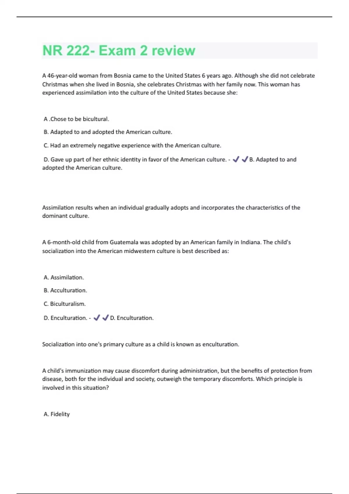 A 46-year-old woman from Bosnia came to the United States 6 years ago. Although she did not celebrate Christmas when she lived in Bosnia, she celebrates Christmas with her family now. This woman has experienced assimilation into the culture of the United States because she: A .Chose to be bicultural. B. Adapted to and adopted the American culture. C. Had an extremely negative experience with the American culture. D. Gave up part of her ethnic identity in favor of the American culture. - B. Adapted to and adopted the American culture. Assimilation results when an individual gradually adopts and incorporates the characteristics of the dominant culture. A 6-month-old child from Guatemala was adopted by an American family in Indiana. The child's socialization into the American midwestern culture is best described as: A. Assimilation. B. Acculturation. C. Biculturalism. D. Enculturation. - D. Enculturation. Socialization into one's primary culture as a child is known as enculturation. A child's immunization may cause discomfort during administration, but the benefits of protection from disease, both for the individual and society, outweigh the temporary discomforts. Which principle is involved in this situation? A. FidelityB. Beneficence C. Nonmaleficence D. Respect for autonomy - B. Beneficence