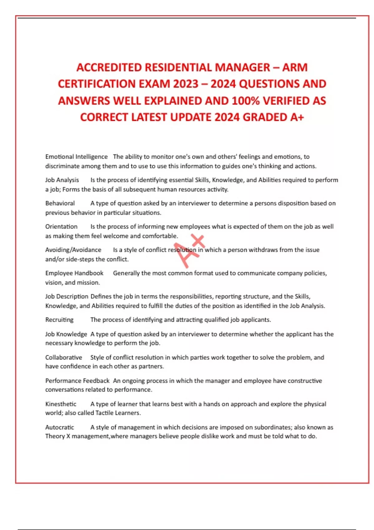 ACCREDITED RESIDENTIAL MANAGER – ARM CERTIFICATION EXAM 2023 – 2024 QUESTIONS AND ANSWERS WELL EXPLAINED AND 100% VERIFIED AS CORRECT LATEST UPDATE 2024 GRADED A+ Emotional Intelligence The ability to monitor one's own and others' feelings and emotions, to discriminate among them and to use to use this information to guides one's thinking and actions. Job Analysis Is the process of identifying essential Skills, Knowledge, and Abilities required to perform a job; Forms the basis of all subsequent human resources activity. Behavioral A type of question asked by an intervie wer to determine a persons disposition based on previous behavior in particular situations. Orientation Is the process of informing new employees what is expected of them on the job as well as making them feel welcome and comfortable. Avoiding/Avoidance Is a style of conflict resolution in which a person withdraws from the issue and/or side-steps the conflict. Employee Handbook Generally the most common format used to communicate company policies, vision, and mission. Job Description Defines the job in terms the responsibilities, reporting structure, and the Skills, Knowledge, and Abilities required to fulfill the duties of the position as identified in the Job Analysis. Recruiting The process of identifying and attracting qualified job applicants. Job Knowledge A type of question asked by an interviewer to determine whether the applicant has the necessary knowledge to perform the job. Collaborative Style of conflict resolution in which parties work together to solve the problem, and have confidence in each other as partners. Performance Feedback An ongoing process in which the manager and employee have constructive conversations related to performance. Kinesthetic A type of learner that learns best with a hands on approach and explore the physical world; also called Tactile Learners. Autocratic A style of management in which decisions are imposed on subordinates; also known as Theory X management,where managers believe people dislike work and must be told what to do. Coaching Is used to develop employees rather than address specific