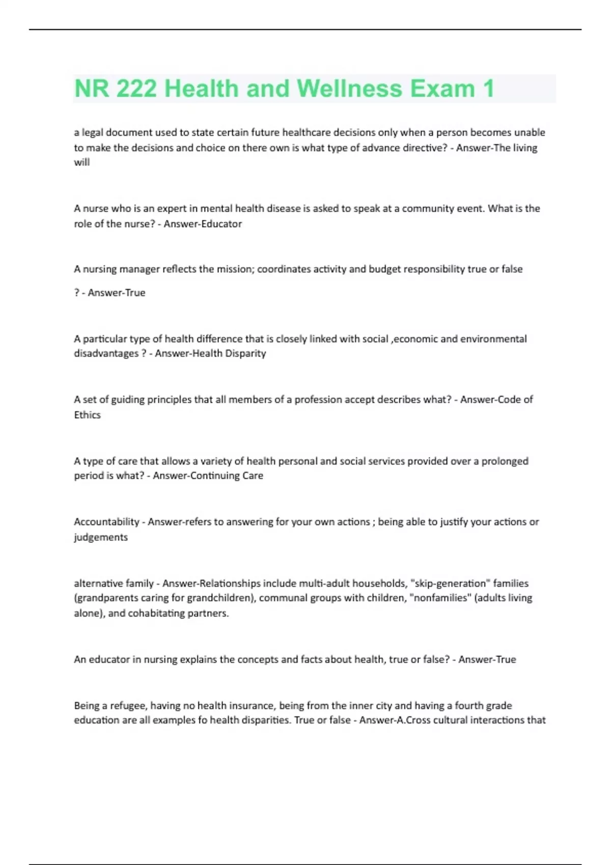 a legal document used to state certain future healthcare decisions only when a person becomes unable to make the decisions and choice on there own is what type of advance directive? - Answer-The living will A nurse who is an expert in mental health disease is asked to speak at a community event. What is the role of the nurse? - Answer-Educator A nursing manager reflects the mission; coordinates activity and budget responsibility true or false ? - Answer-True A particular type of health difference that is closely linked with social ,economic and environmental disadvantages ? - Answer-Health Disparity A set of guiding principles that all members of a profession accept describes what? - Answer-Code of Ethics A type of care that allows a variety of health personal and social services provided over a prolonged period is what? - Answer-Continuing Care Accountability - Answer-refers to answering for your own actions ; being able to justify your actions or judgements alternative family - Answer-Relationships include multi-adult households, "skip-generation" families (grandparents caring for grandchildren), communal groups with children, "nonfamilies" (adults living alone), and cohabitating partners. An educator in nursing explains the concepts and facts about health, true or false? - Answer-True Being a refugee, having no health insurance, being from the inner city and having a fourth grade education are all examples fo health disparities. True or false - Answer-A.Cross cultural interactions thatprovide limited opportunities to learn about other culture is a form of culture competency. True or False? Best way describe health disparity is : - Answer-A situation one cannot help blended family - Answer-a married couple and their children from previous marriages or other parenting relationships Care for self, care for family, care for peers and care for clients are under Chamberlain Care? True or False - Answer-False Centers for Medicare and Medicaid Services (CMS) - Answer-the federal government agency that administers Medicare and Medicaid -provides incentives for treating specific patient population Describe Primary Prevention - Answer-It is true prevention , its goal is to reduce the incidence of disease DNR - Answer-_order means that if one is to stop breathing or heart stops, nothing will be done to try to keep alive durable power of attorney for health care - Answer-A type of advance directive executed by a competent adult that appoints another individual to make medical treatment decisions on his or her behalf in the event that the person making the appointment loses decision-making capacity