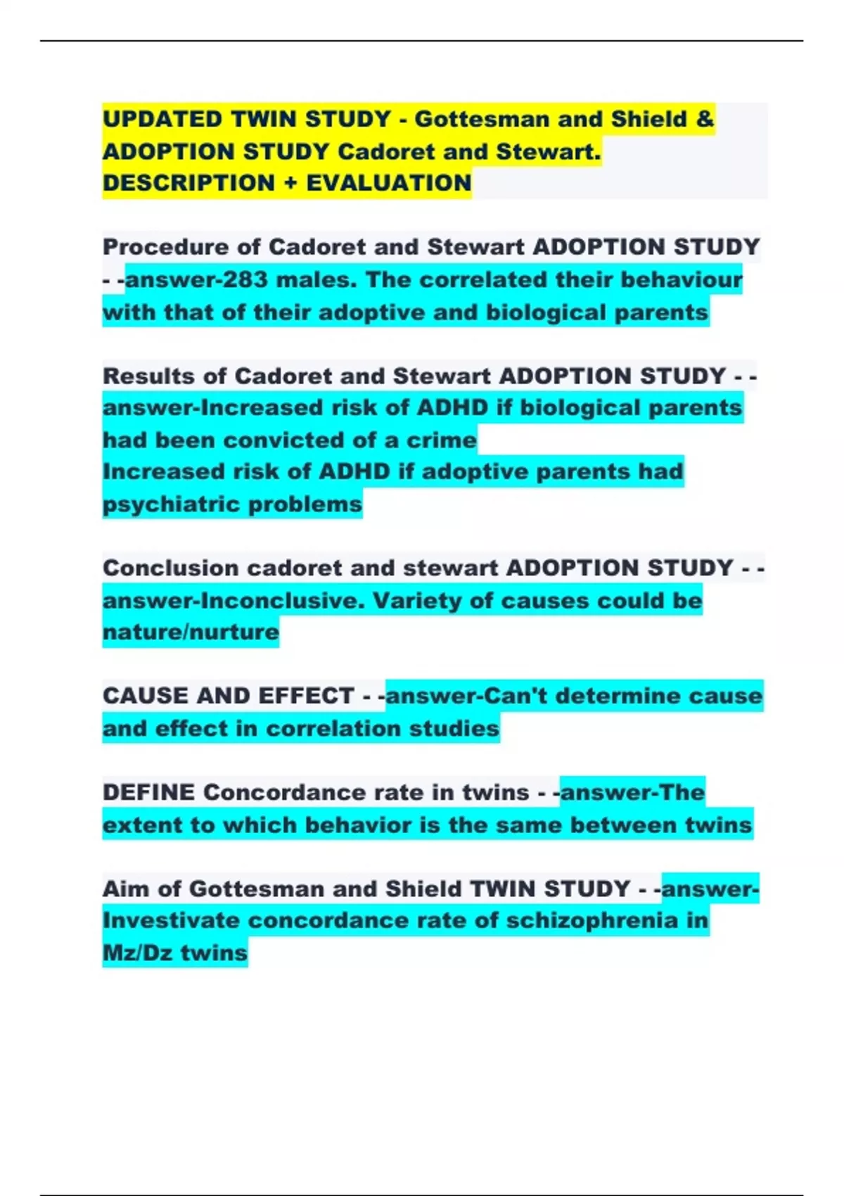 UPDATED TWIN STUDY - Gottesman and Shield & ADOPTION STUDY Cadoret and Stewart. DESCRIPTION + EVALUATION Procedure of Cadoret and Stewart ADOPTION STUDY - -answer-283 males. The correlated their behaviour with that of their adoptive and biological parents Results of Cadoret and Stewart ADOPTION STUDY - - answer-Increased risk of ADHD if biological parents had been convicted of a crime Increased risk of ADHD if adoptive parents had psychiatric problems Conclusion cadoret and stewart ADOPTION STUDY - - answer-Inconclusive. Variety of causes could be nature/nurture CAUSE AND EFFECT - -answer-Can't determine cause and effect in correlation studies DEFINE Concordance rate in twins - -answer-The extent to which behavior is the same between twins Aim of Gottesman and Shield TWIN STUDY - -answerInvestivate concordance rate of schizophrenia in Mz/Dz twin