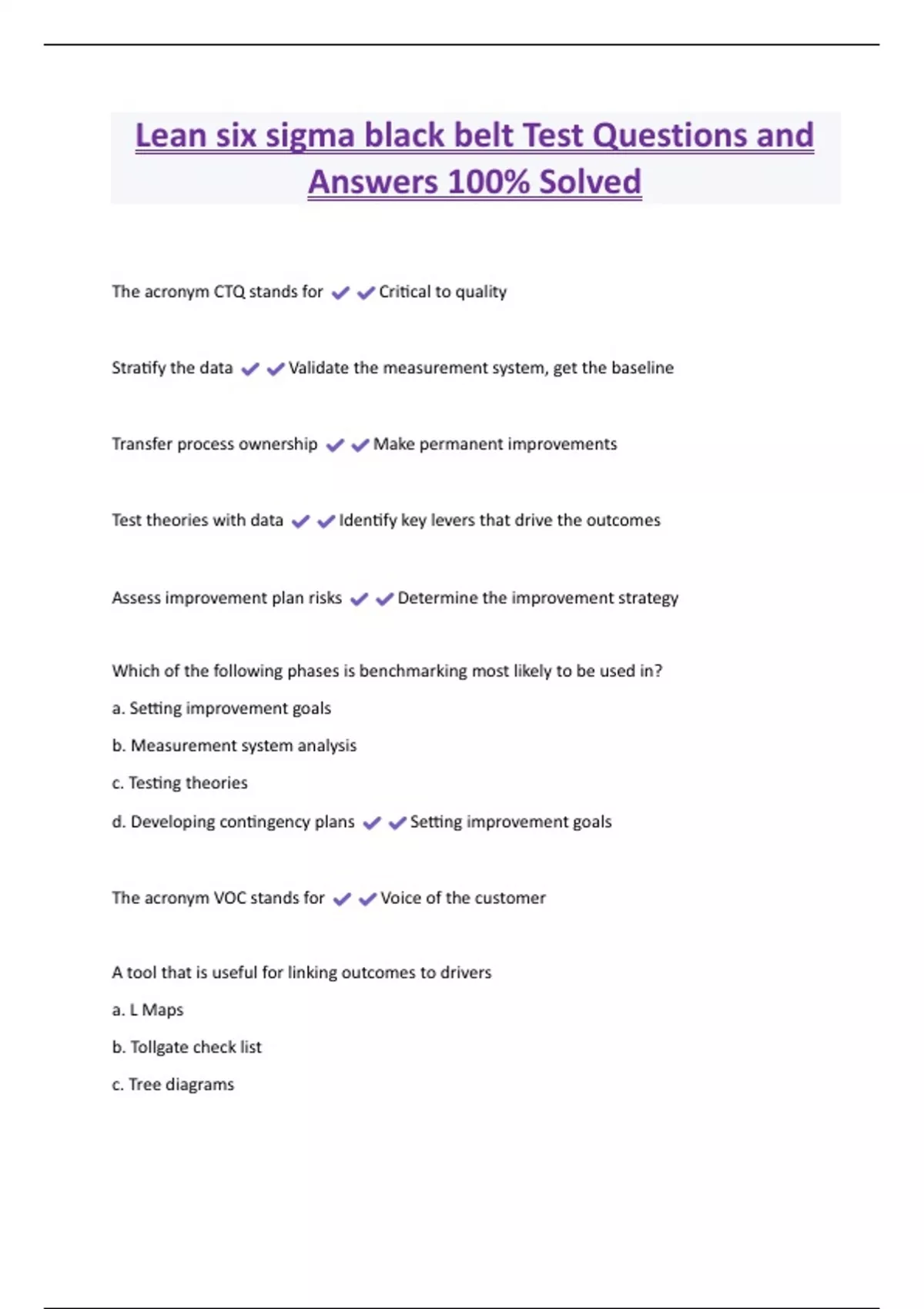 Lean six sigma black belt Test Questions and Answers 100% Solved The acronym CTQ stands for Critical to quality Stratify the data Validate the measurement system, get the baseline Transfer process ownership Make permanent improvements Test theories with data Identify key levers that drive the outcomes Assess improvement plan risks Determine the improvement strategy Which of the following phases is benchmarking most likely to be used in? a. Setting improvement goals b. Measurement system analysis