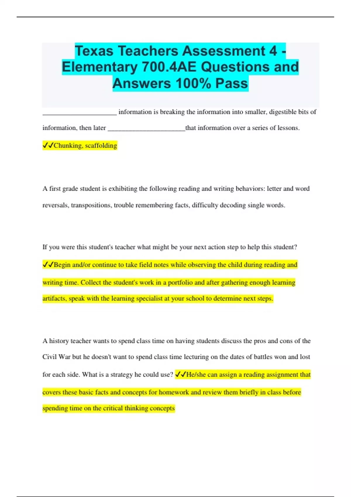 Texas Teachers Assessment 4 - Elementary 700.4AE Questions and Answers 100% Pass _____________________ information is breaking the information into smaller, digestible bits of information, then later ______________________that information over a series of lessons. Chunking, scaffolding A first grade student is exhibiting the following reading and writing behaviors: letter and word reversals, transpositions, trouble remembering facts, difficulty decoding single words. If you were this student's teacher what might be your next action step to help this student? Begin and/or continue to take field notes while observing the child during reading and writing time. Collect the student's work in a portfolio and after gathering enough learning artifacts, speak with the learning specialist at your school to determine next steps. A history teacher wants to spend class time on having students discuss the pros and cons of the Civil War but he doesn't want to spend class time lecturing on the dates of battles won and lost for each side. What is a strategy he could use? He/she can assign a reading assignment that covers these basic facts and concepts for homework and review them briefly in class before spending time on the critical thinking concepts A second grade teacher is teaching her students multi-syllable words. Before they read a short story, she introduces multi-syllable words students may have difficulty decoding. She sounds out the words such as: beau/ti/ful and com/plete/ly and asks students which letters make each sound. She then writes the word on the board and asks students to copy it and say it aloud. Then, they take turn reading parts of the story aloud sounding out the multi syllable words. Which method of phonics instruction is she using? Synthetic phonics A teacher is having trouble with class participation. When she asks questions only a few students raise their hands to respond and she always resorts to calling on these few bright students who know all the answers. Which of the following strategies would you recommend to help her increase student engagement and participation during discussions? Implement a randomization strategy such as pulling popsicle sticks with student's names on them to encourage participation from all students. Have students answer the question with a partner first and then ask pairs to respond. According to Wiggins, what are the qualities of effective feedback? Timely, specific, formed to allow for student adjustment, clearly communicated Administering a learning styles inventory and/or a student interest survey at the beginning of each school year is valuable because: It can help you gather information about your students that will allow you to better understand how your students learn and what their interests are to create lessons and activities that engage them and meet varying learning needs. After reading the short story version of A Christmas Carol to her second-grade students, Mrs. Stevens asks her students the following questions: What do you think will happen to Scrooge after this Christmas experience? What other stories have your read or movies have you seen where someone really disliked something? Why do you think Scrooge changed his