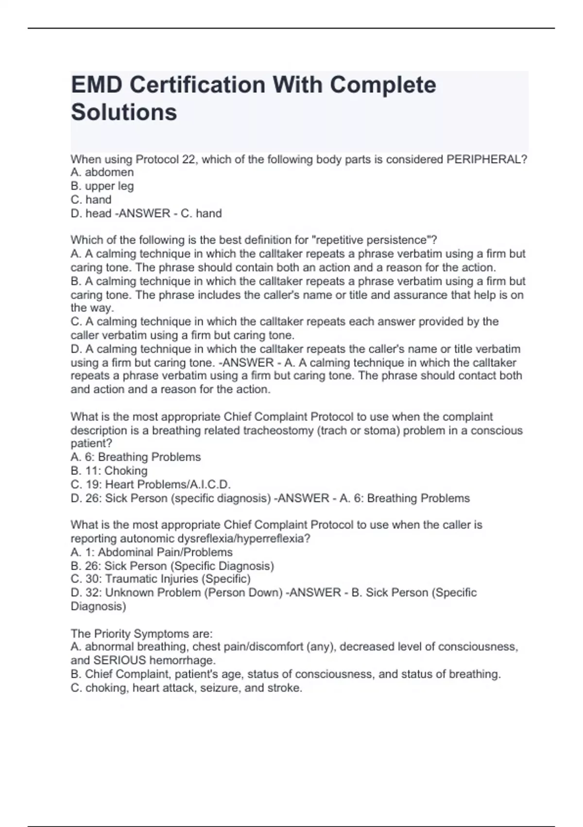 When using Protocol 22, which of the following body parts is considered PERIPHERAL? A. abdomen B. upper leg C. hand D. head -ANSWER - C. hand Which of the following is the best definition for "repetitive persistence"? A. A calming technique in which the calltaker repeats a phrase verbatim using a firm but caring tone. The phrase should contain both an action and a reason for the action. B. A calming technique in which the calltaker repeats a phrase verbatim using a firm but caring tone. The phrase includes the caller's name or title and assurance that help is on the way. C. A calming technique in which the calltaker repeats each answer provided by the caller verbatim using a firm but caring tone. D. A calming technique in which the calltaker repeats the caller's name or title verbatim using a firm but caring tone. -ANSWER - A. A calming technique in which the calltaker repeats a phrase verbatim using a firm but caring tone. The phrase should contact both and action and a reason for the action. What is the most appropriate Chief Complaint Protocol to use when the complaint description is a breathing related tracheostomy (trach or stoma) problem in a conscious patient? A. 6: Breathing Problems B. 11: Choking C. 19: Heart Problems/A.I.C.D. D. 26: Sick Person (specific diagnosis) -ANSWER - A. 6: Breathing Problems What is the most appropriate Chief Complaint Protocol to use when the caller is reporting autonomic dysreflexia/hyperreflexia? A. 1: Abdominal Pain/Problems B. 26: Sick Person (Specific Diagnosis) C. 30: Traumatic Injuries (Specific) D. 32: Unknown Problem (Person Down) -ANSWER - B. Sick Person (Specific Diagnosis) The Priority Symptoms are: A. abnormal breathing, chest pain/discomfort (any), decreased level of consciousness, and SERIOUS hemorrhage. B. Chief Complaint,