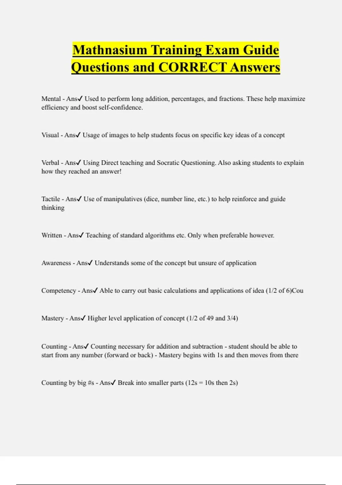 Mathnasium Training Exam Guide Questions and CORRECT Answers Mental - Ans Used to perform long addition, percentages, and fractions. These help maximize efficiency and boost self-confidence. Visual - Ans Usage of images to help students focus on specific key ideas of a concept Verbal - Ans Using Direct teaching and Socratic Questioning. Also asking students to explain how they reached an answer