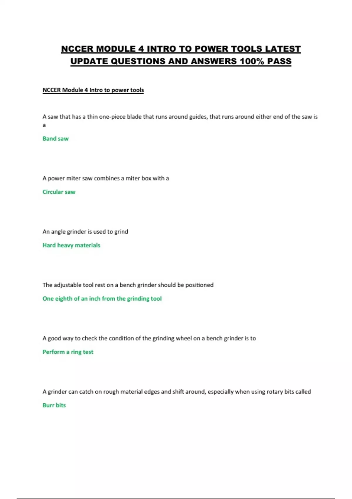 NCCER MODULE 4 INTRO TO POWER TOOLS EXAM QUESTIONS AND ANSWERS LATEST UPDATE (100% PASS) A saw that has a thin one-piece blade that runs around guides, that runs around either end of the saw is a Band saw A power miter saw combines a miter box with a Circular saw An angle grinder is used to grind Hard heavy materials The adjustable tool rest on a bench grinder should be positioned One eighth of an inch from the grinding tool A good way to check the condition of the grinding wheel on a bench grinder is to Perform a ring test