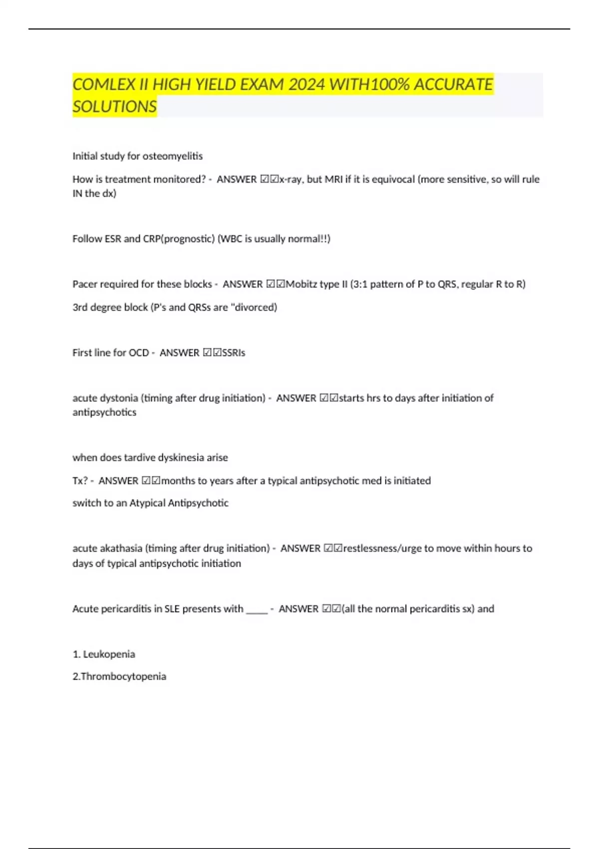 Initial study for osteomyelitis How is treatment monitored? - ANSWER ☑☑x-ray, but MRI if it is equivocal (more sensitive, so will rule IN the dx) Follow ESR and CRP(prognostic) (WBC is usually normal!!) Pacer required for these blocks - ANSWER ☑☑Mobitz type II (3:1 pattern of P to QRS, regular R to R) 3rd degree block (P's and QRSs are "divorced) First line for OCD - ANSWER ☑☑SSRIs acute dystonia (timing after drug initiation) - ANSWER ☑☑starts hrs to days after initiation of antipsychotics when does tardive dyskinesia arise Tx? - ANSWER ☑☑months to years after a typical antipsychotic med is initiated switch to an Atypical Antipsychotic acute akathasia (timing after drug initiation) - ANSWER ☑☑restlessness/urge to move within hours to days of typical antipsychotic initiation Acute pericarditis in SLE presents with ____ - ANSWER ☑☑(all the normal pericarditis sx) and 1. Leukopenia 2.Thrombocytopenia