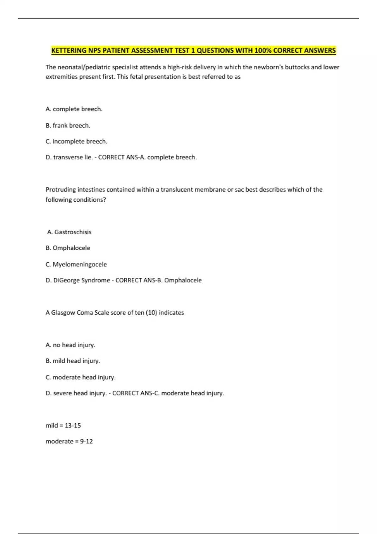 KETTERING NPS PATIENT ASSESSMENT TEST 1 QUESTIONS WITH 100% CORRECT ANSWERS The neonatal/pediatric specialist attends a high-risk delivery in which the newborn's buttocks and lower extremities present first. This fetal presentation is best referred to as A. complete breech. B. frank breech. C. incomplete breech. D. transverse lie. - CORRECT ANS-A. complete breech. Protruding intestines contained within a translucent membrane or sac best describes which of the following conditions? A. Gastroschisis B. Omphalocele C. Myelomeningocele D. DiGeorge Syndrome - CORRECT ANS-B. Omphalocele A Glasgow Coma Scale score of ten (10) indicates A. no head injury. B. mild head injury. C. moderate head injury. D. severe head injury. - CORRECT ANS-C. moderate head injury. mild = 13-15 moderate = 9-12 CONTINUES...