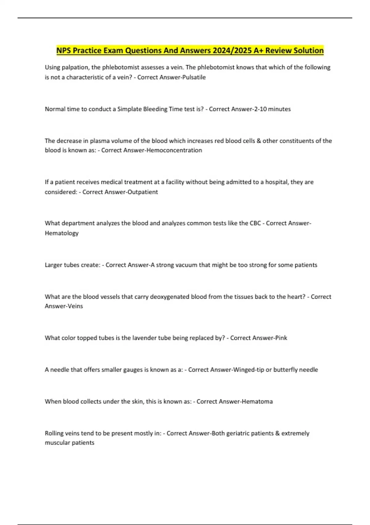 NPS Practice Exam Questions And Answers 2024/2025 A+ Review Solution Using palpation, the phlebotomist assesses a vein. The phlebotomist knows that which of the following is not a characteristic of a vein? - Correct Answer-Pulsatile Normal time to conduct a Simplate Bleeding Time test is? - Correct Answer-2-10 minutes The decrease in plasma volume of the blood which increases red blood cells & other constituents of the blood is known as: - Correct Answer-Hemoconcentration If a patient receives medical treatment at a facility without being admitted to a hospital, they are considered: - Correct Answer-Outpatient What department analyzes the blood and analyzes common tests like the CBC - Correct AnswerHematology Larger tubes create: - Correct Answer-A strong vacuum that might be too strong for some patients What are the blood vessels that carry deoxygenated blood from the tissues back to the heart? - Correct Answer-Veins What color topped tubes is the lavender tube being replaced by? - Correct Answer-Pink A needle that offers smaller gauges is known as a: - Correct Answer-Winged-tip or butterfly needle When blood collects under the skin, this is known as: - Correct Answer-Hematoma Rolling veins tend to be present mostly in: - Correct Answer-Both geriatric patients & extremely muscular patients